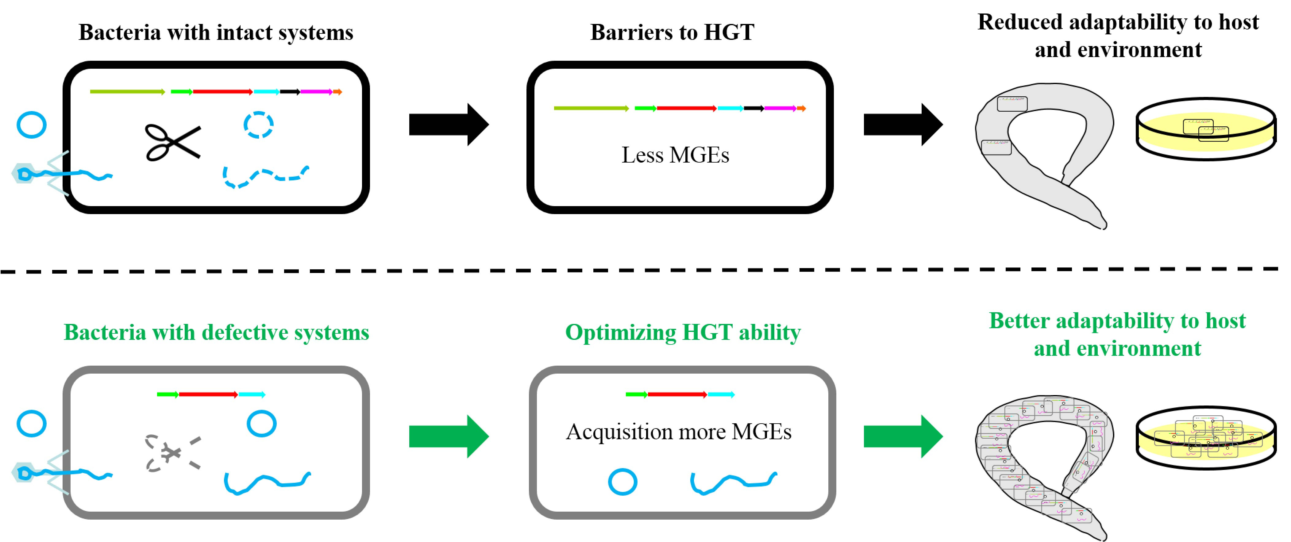 To understand the ecological significance of this evolution, we conducted a comparative genomic analysis and revealed that the CRISPR-Cas systems are barriers to HGT within this group, since we observe that strains harboring active systems have limited environmental distribution, fewer MGEs, and have lower allelic diversity compared to the strains with defective or without any CRISPR-Cas systems. We proposed that B. cereus group evolved by inactivation of CRISPR-Cas systems to facilitate acquisition of beneficial MGEs for better adaptation to diverse environments and hosts (Fig. 2).