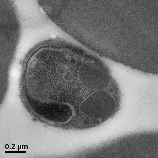 Malaria merozoite attached to a human red blood cell prior to invasion (electron microscopy)