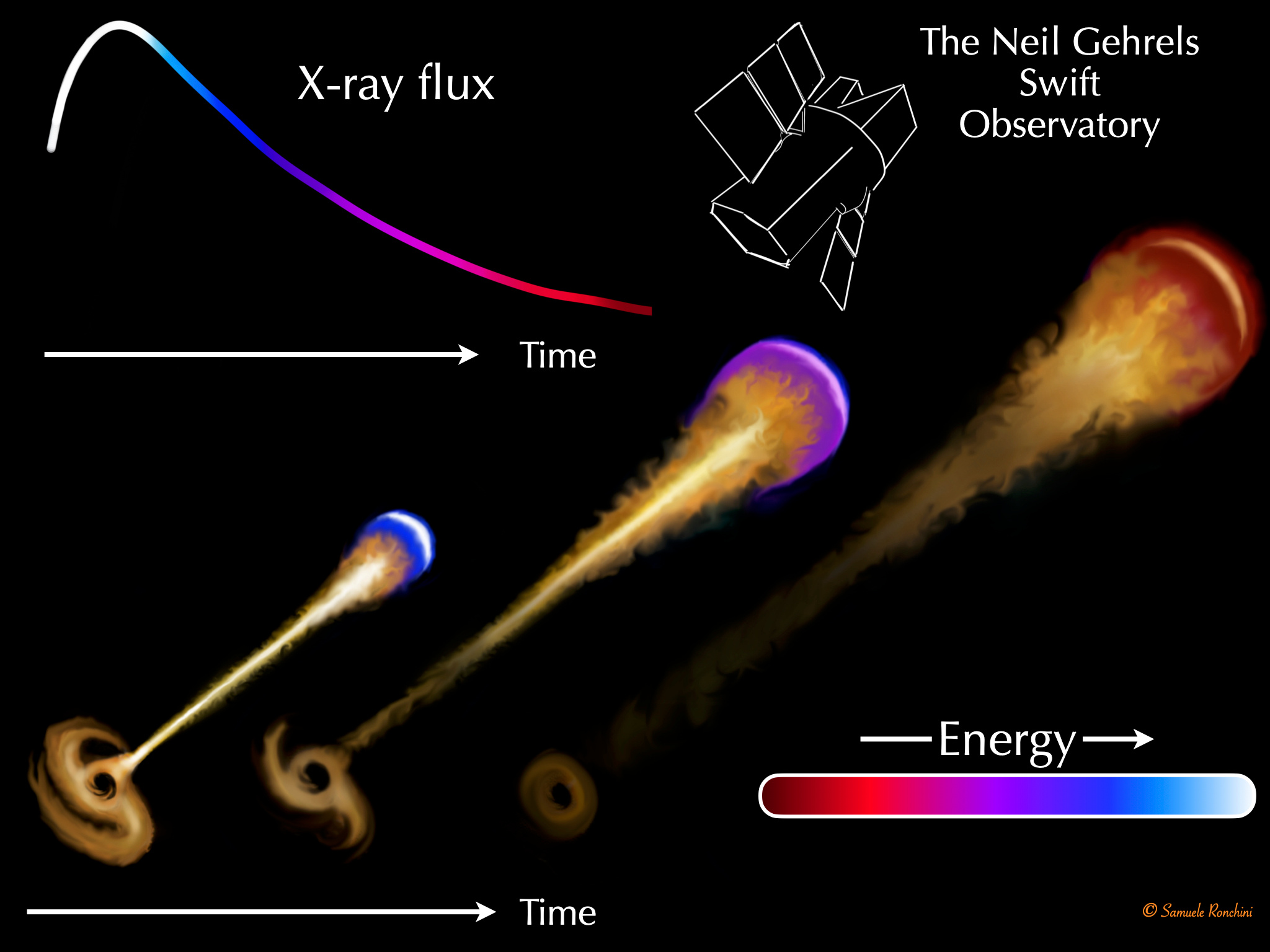 A gamma-ray burst (GRB) is able to release in fractions of a second the entire energy emitted by a star like our Sun throughout its life, making it known as one of the most catastrophic and energetic events in the Universe. The discovery of supernovae and gravitational waves associated with GRBs has confirmed that these phenomena may be is some cases the product of the collapse of a massive star, or in others the merger of two neutron stars. Known since the 1960s, their nature remained debated until the advent of the Neil Gehrels "Swift" Observatory, in orbit since 2004 and dedicated to the detection, localisation and characterisation of GRBs. After years of multi-band data collection, from radio frequencies to gamma-rays, we know that GRBs are associated with collimated jets launched by the central compact object. The jet launching mechanism, which is still not well understood, is able to convert the accretion energy into an ultra-relativistic expanding outflow. The particles carried by the jet are accelerated via internal shocks or in magnetic reconnection regions, converting their kinetic energy into electromagnetic radiation, which usually peaks initially in the gamma-ray band. The jet then emits radiation at lower frequencies when it encounters and interacts with the interstellar medium, giving the so-called afterglow phase, which can last for hours or days after the initial gamma-ray flash.