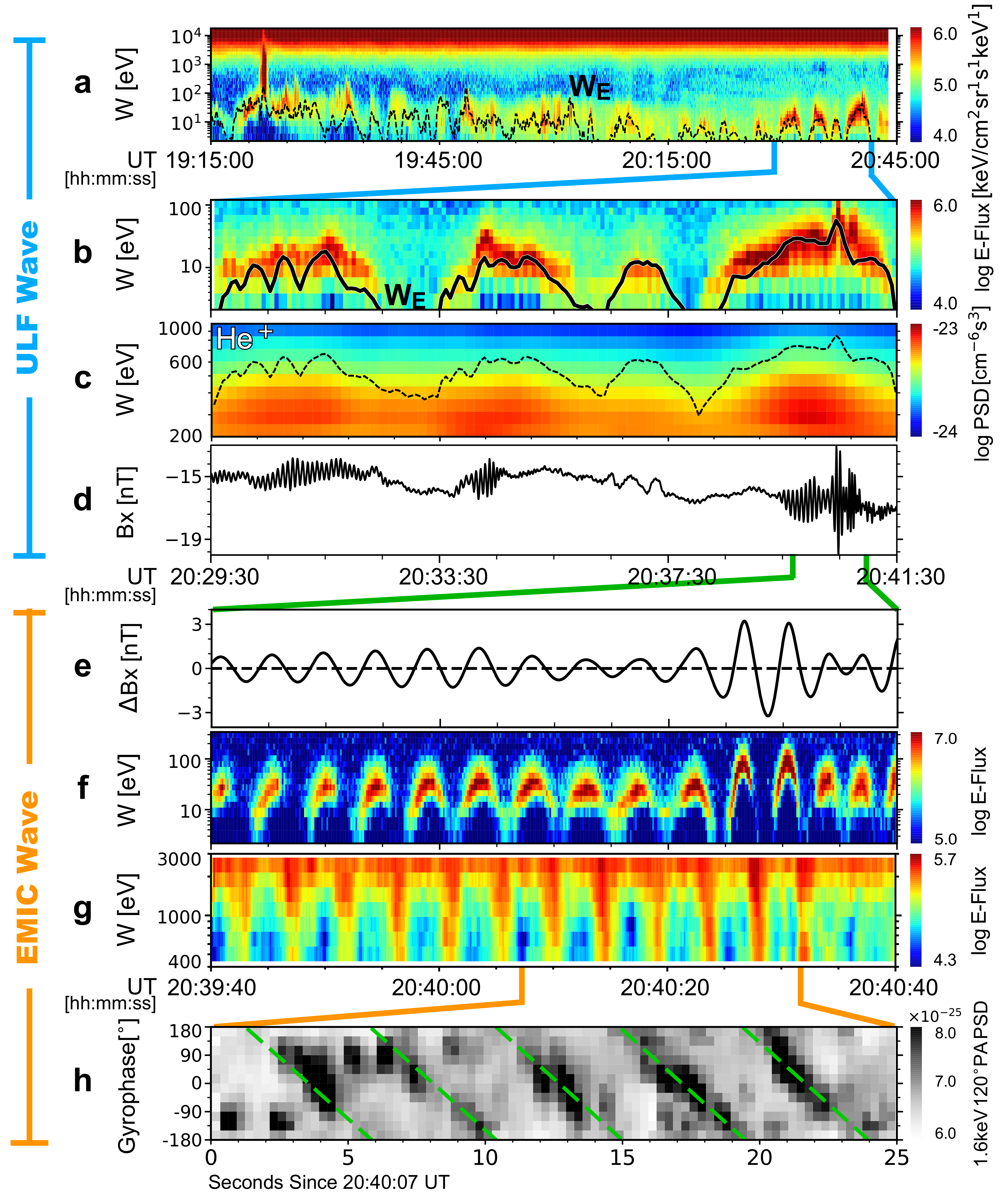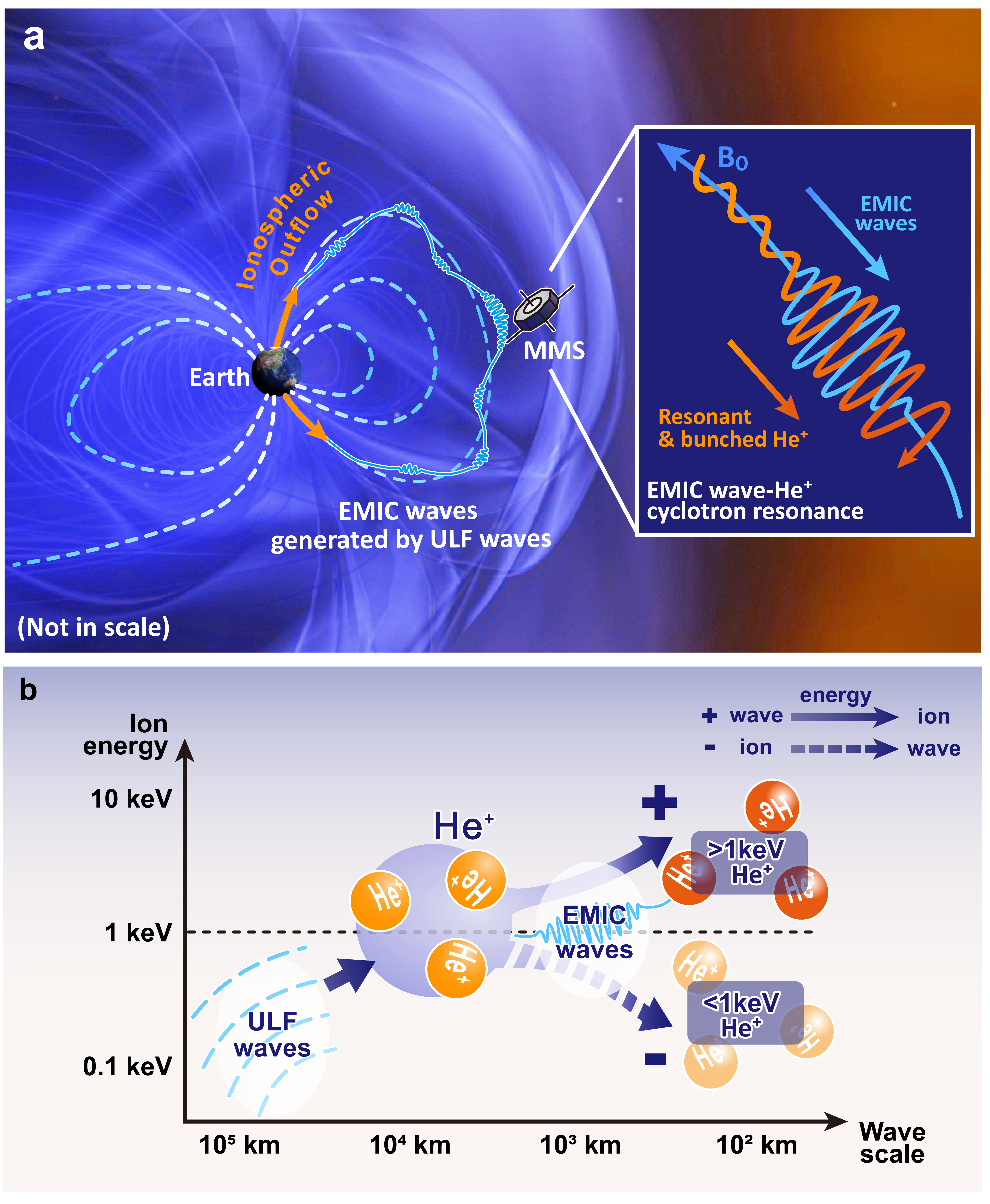 To answer this question, we did a series of studies based on the observations obtained by NASA’s Magnetospheric Multiscale (MMS), and finally found that cross-scale wave-particle interactions, namely, simultaneous interactions between particles and plasma waves of different scales, can be a candidate for the mechanisms we search for (Fig. 1). Plasma waves are analogous to sound waves in the air. However, the difference of at least three orders of magnitude in the masses of the constituents of plasmas (e.g., protons and electrons) brings with them an enormous richness of spatial and temporal scales. Roughly, plasma waves can be divided into three classes according to their scales: fluid scale, ion-gyration scale and electron-gyration scale waves, with the first scale also termed macroscale and the last two termed microscale. Waves of different scales would interact with plasma particles in different ways. For example, magnetospheric ultra-low-frequency (ULF) waves, which are Alfven mode in nature and are generally of macroscales, can interact with particles through drift-bounce resonance. On the other hand, electromagnetic ion cyclotron (EMIC) waves, which are microscale waves as their frequency is close to ion gyro-frequency, generally modulate particle motion via cyclotron resonance. Wave-particle interactions can result in efficient energy exchange between waves and particles, no matter what the detailed forms are.