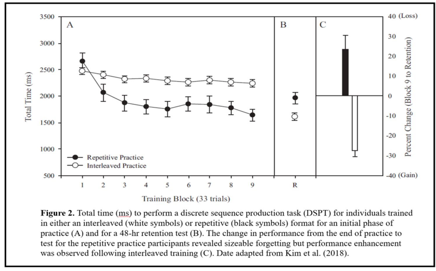 The focus of our study was on new evidence illustrating the efficacy of learning multiple motor skills through greater contextual interference (CI) during training. CI is a scheduling protocol that has been demonstrated to garner greater motor skill acquisition by performing multiple motor tasks in an interleaved practice (IP) format. Conversely, repetitive practice (RP) creates significantly less interference because it involves the repeated execution of the same motor task before further practice with other motor tasks.