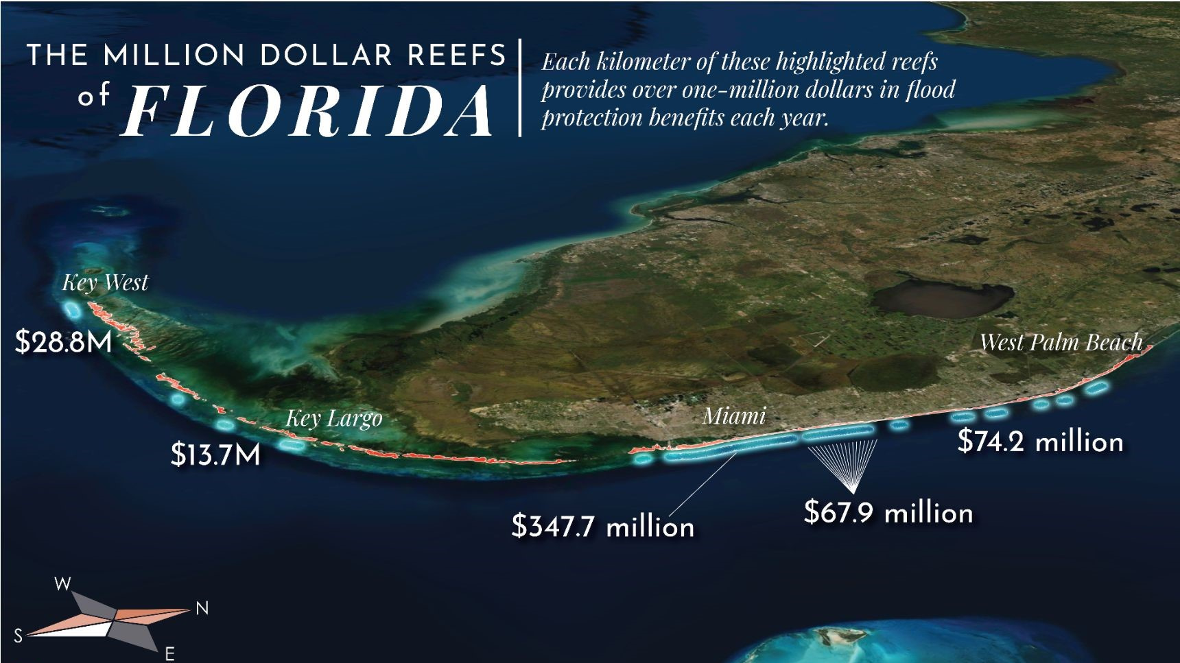 Million Dollar Reefs. There are more than 325 kilometers of $Million Dollar coral reefs across the US that reduce storm damages by >$1M/km annually. Map developed with J. Kendall and C. Lowrie.