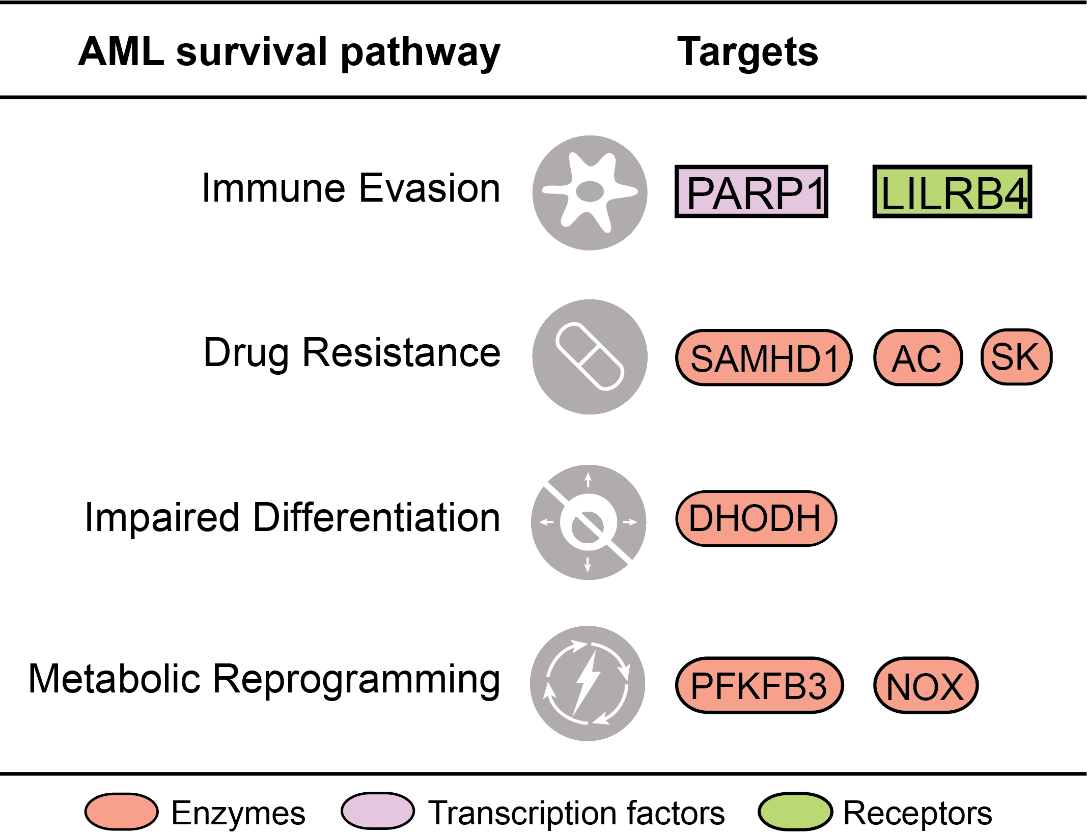 After decades of inactivity, there is finally some movement in the treatment strategy of AML patients. As opposed to the standard Cytarabine+Daunorubicin combination, the newly approved drugs are specifically targeting proteins and pathways that are all involved in survival signaling of AML cells (rather than induction of apoptosis by disrupting DNA replication). Thanks to the increased knowledge of AML biology and survival pathways, we now have much more information and insights into how AML cells can survive and propagate. For this review, we wanted to look into these new findings and extract those with promising preclinical potencies to help fight the battle against AML. After searching the current literature, we found that the pathways involved in AML survival could be categorized into some of the major hallmarks of cancer. These included immune evasion, differentiation impairment, and metabolic reprogramming. An additional category we wanted to add was drug resistance, which is very relevant in AML. A subset of the targets has moved forward from clinical trials and has even made it to approval. However, in this review, we wanted to focus on the newcomers since there are already recently published reviews about the successful candidates in the clinical trials (Figure 1).