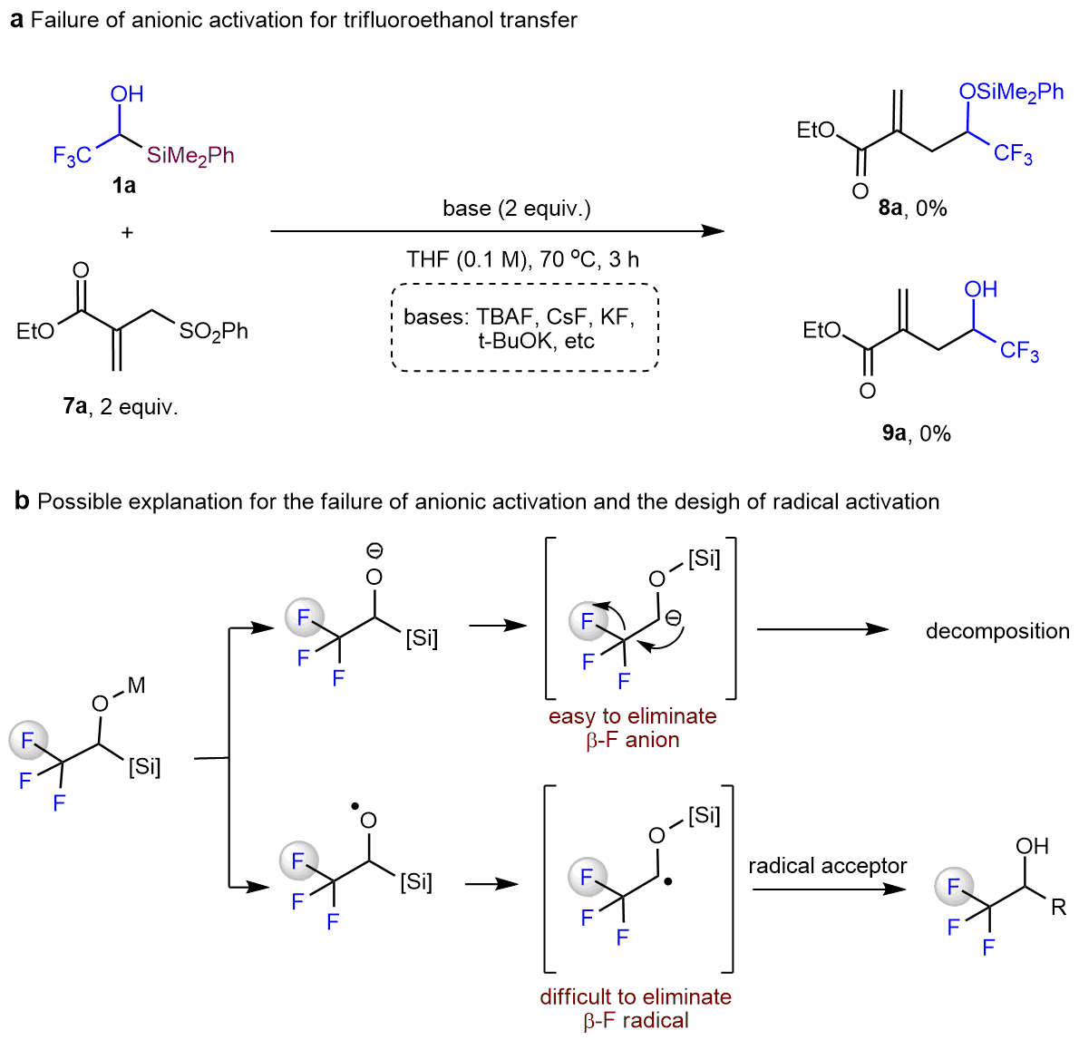 Reagent 1a and 2a are easily prepared in three steps from commercial available starting materials. However, when we test the anionic activation mode (the most widely used strategy) to activate the C-Si bond of 1a, no desired product was observed, but the reagent was consumed completedly (Fig 2a). We think that the decomposition of compound 1a might result from the facile fluoride elimination of β-fluoro carbanions (Fig. 2b). It is known that fluorine radical possesses much higher energy than fluorine anion does. Therefore, we envisioned that in-situ generated carbon radical from alkoxyl radicals should not prefer β-F elimination. Consequently, they could be trapped by radical acceptors to generate trifluoroethanol transfer products (Fig. 2b).