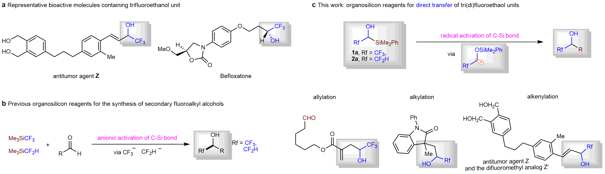 Fluoroalkylsilicon reagents, such as TMSCF3 (Rupert-Prakash reagent), TMSCF2H and others are widely used reagents in the synthesis of organofluorine compounds. Among various fluorine-containing molecules, the secondary fluoroalkyl alcohols are of particular importance; monoamine oxidase A inhibitor Befloxatone and antitumor agent Z are examples of bioactive molecules containing trifluoroethanol motif (Fig. 1a). Anionic activation of C-Si bond of fluoroalkylsilicon reagents by Lewis bases is a powerful method to transfer α-fluoro carbanions into aldehydes, affording fluoroalkyl alcohol products (Fig. 1b). However, the synthetic chemistry based on carbonyl group (Fig. 1b) possesses some limitations: 1) many aldehydes are not stable and/or need multistep synthesis; 2) it is hard to control the regioselectivity when there are more than one aldehyde sites in the same molecule. Moreover, the design and synthesis of pharmacuticals call for strategies to incorporate important structural motifs at late-stage, because this will aviod de novo synthesis. Therefore, we enviosioned that the development of organosilicon reagents such as 1a and 2a which allows direct transfer of trifluoroethanol and difluoroethanol into organic molecules would represent a conceptually different means to construct fluoroalkyl alcohols (Fig. 1c).