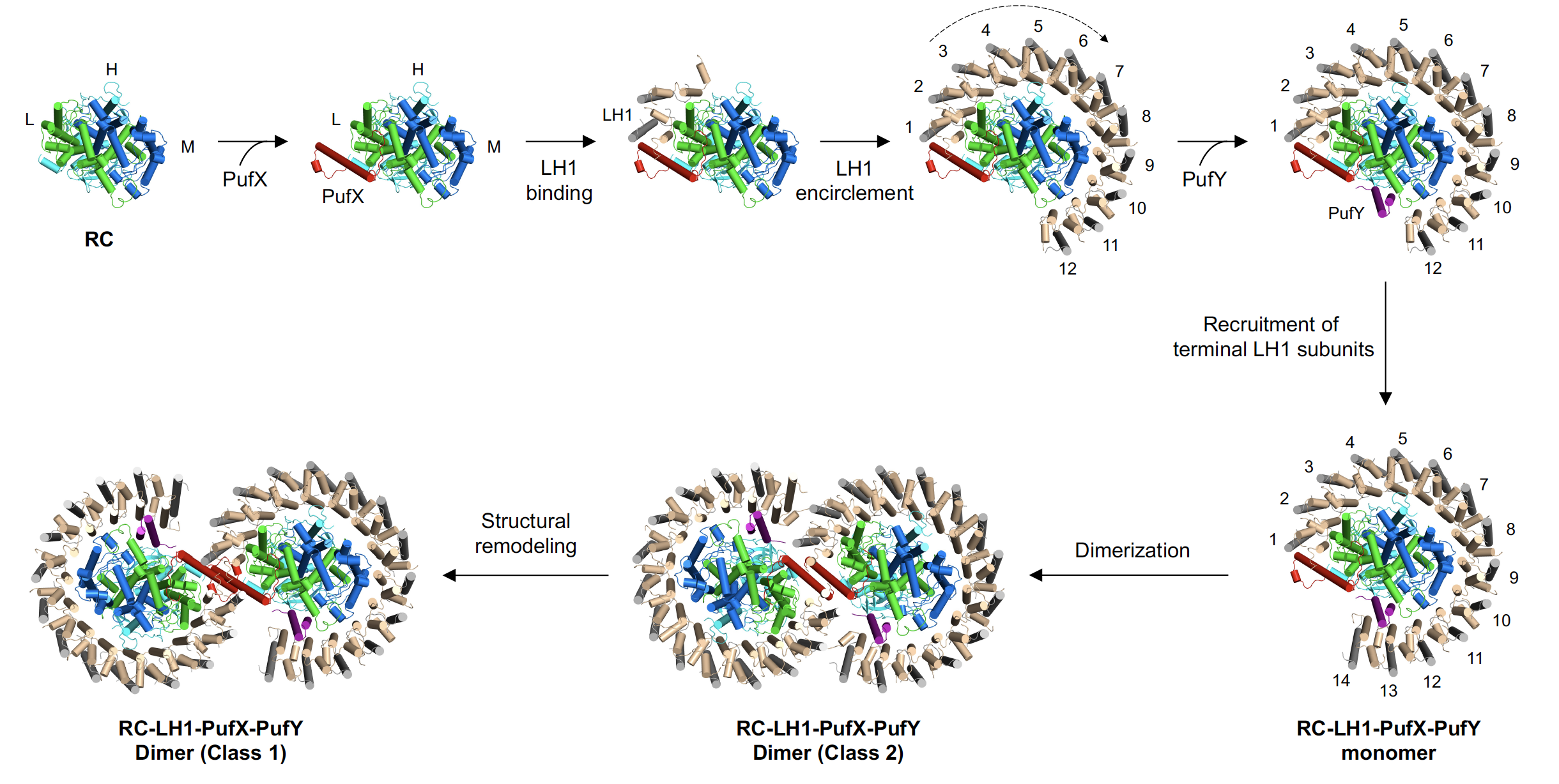 Possible assembly pathway of the dimeric RC–LH1 core complex