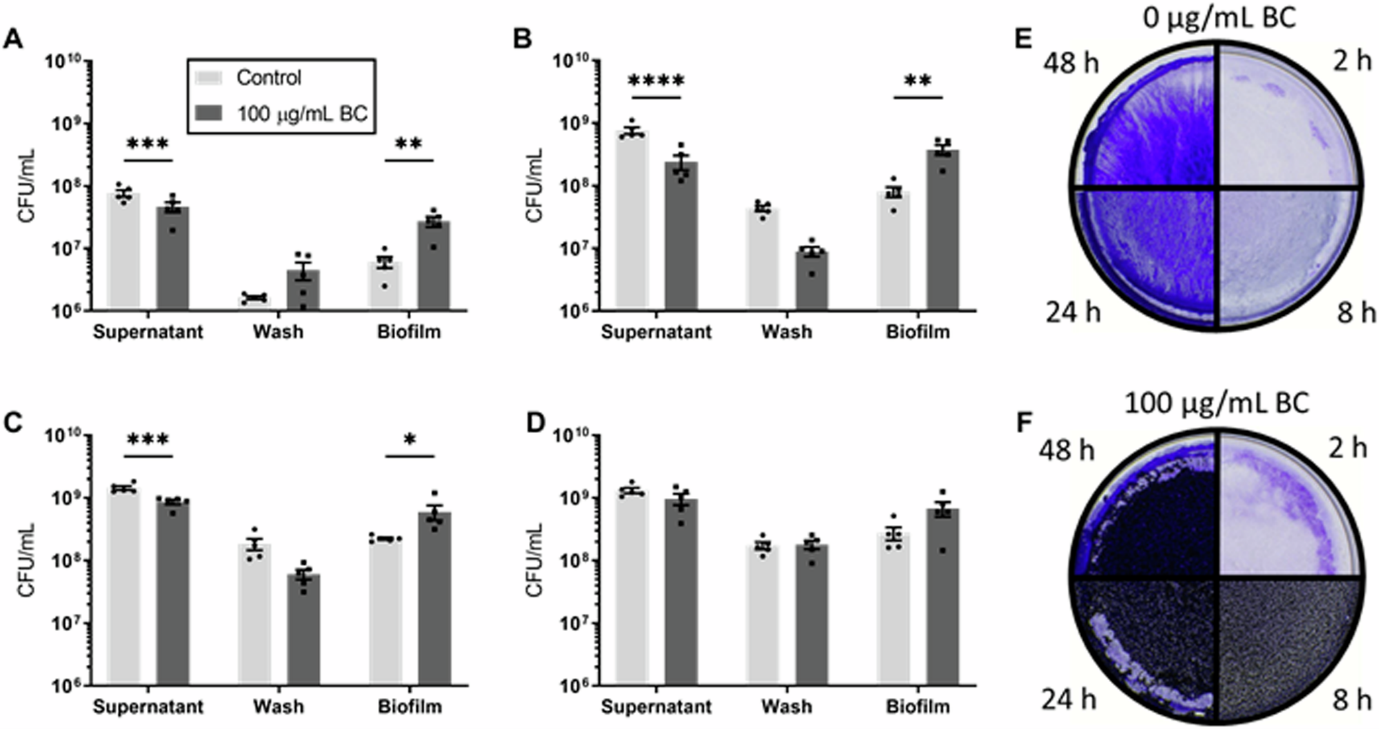 The effect of black carbon particulate pollution on Snodgrassella biofilms at different timepoints. Snodgrassella biofilm growth at timepoints: A) 2 hours, B) 8 hours, C) 24 hours and D) 48 hours and images of stained biofilms at different timepoints E) control and F) black carbon exposed.
