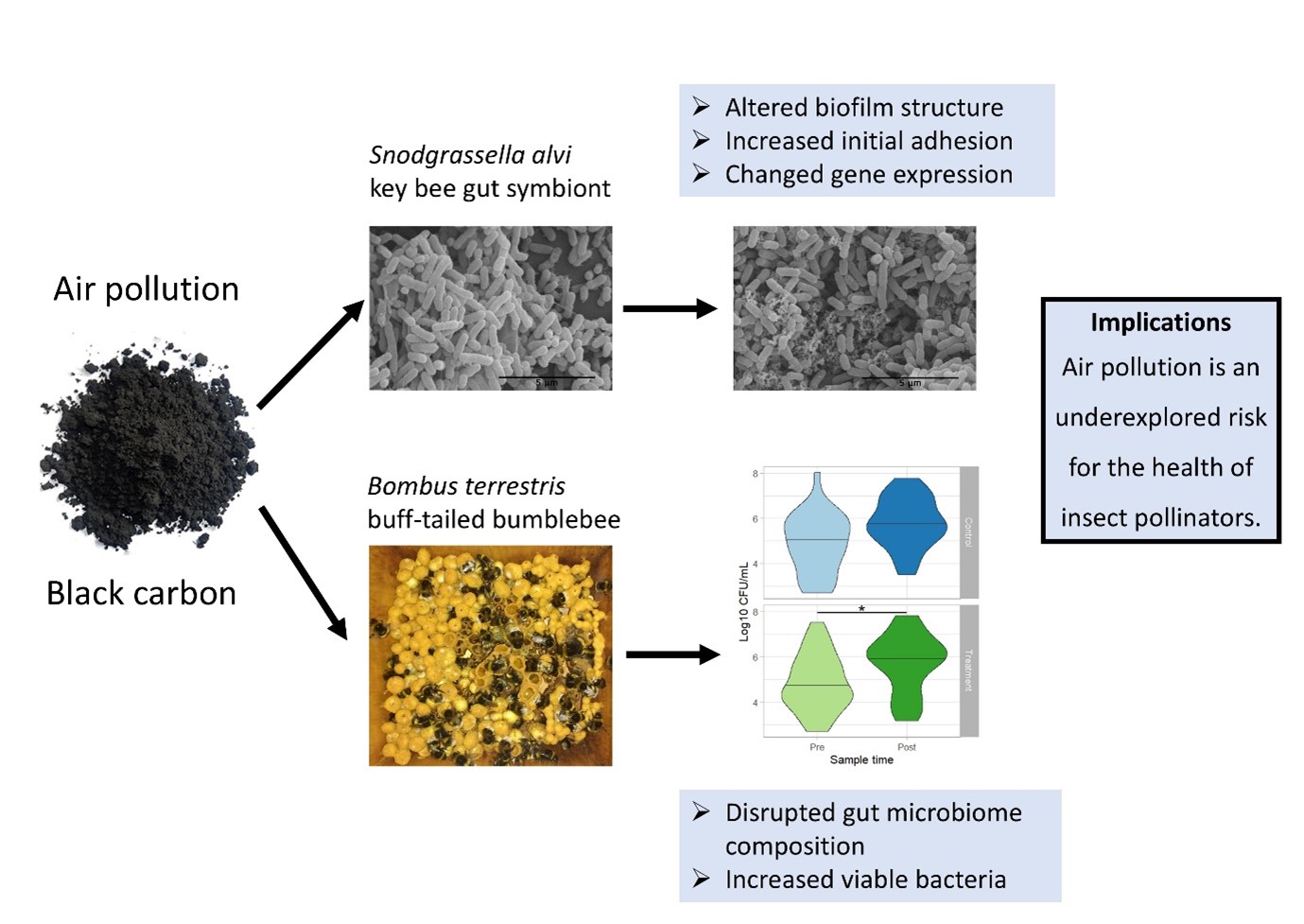 We analysed the remaining paired samples, finding that after black carbon treatment, the gut microbiome composition was significantly different in the treatment group only, revealing disruption of the bumblebee gut microbiome. These findings demonstrate that black carbon exposure has direct, measurable effects on bees’ beneficial commensal bacteria and microbiome. Together these data highlight that particulate matter air pollution, is an underexplored risk to insect pollinator health and warrants further study. This research is just the beginning.