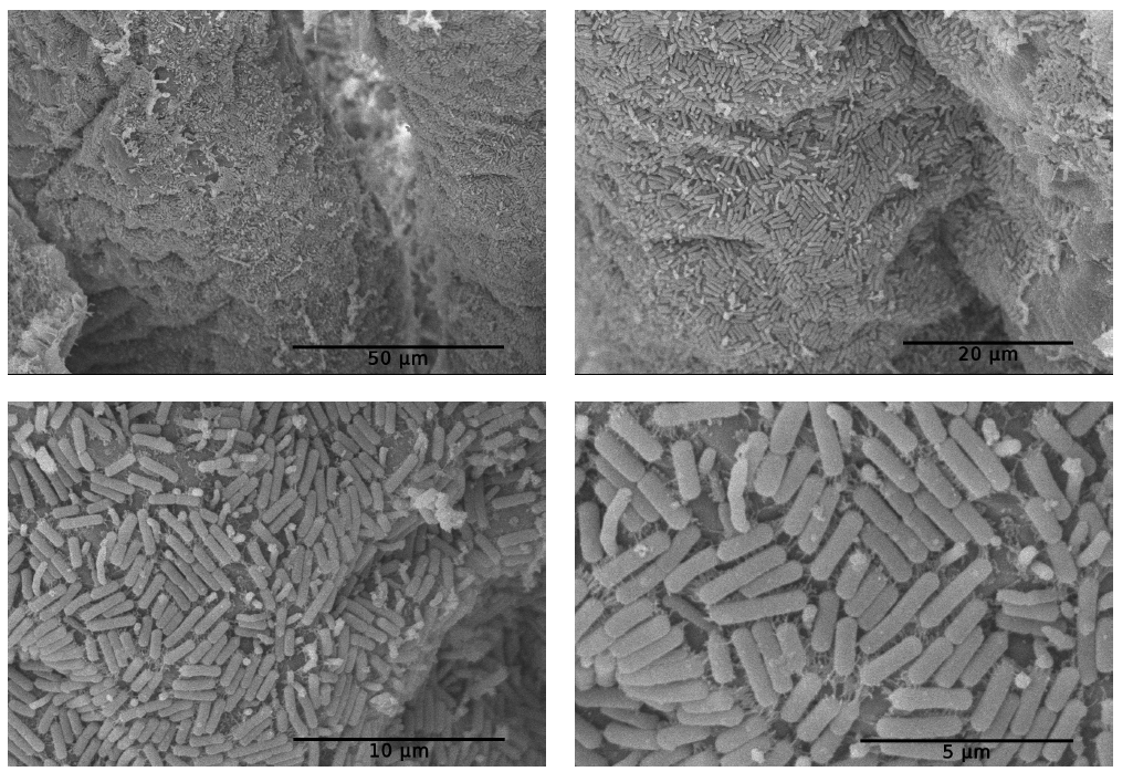 Images of the bee gut microbiome showing highly organised and connected bacteria in the bumblebee’s large intestine. Images are of the same section at increasing magnifications (taken by Hannah Sampson, using the Electron Microscopy Facility, University of Leicester).