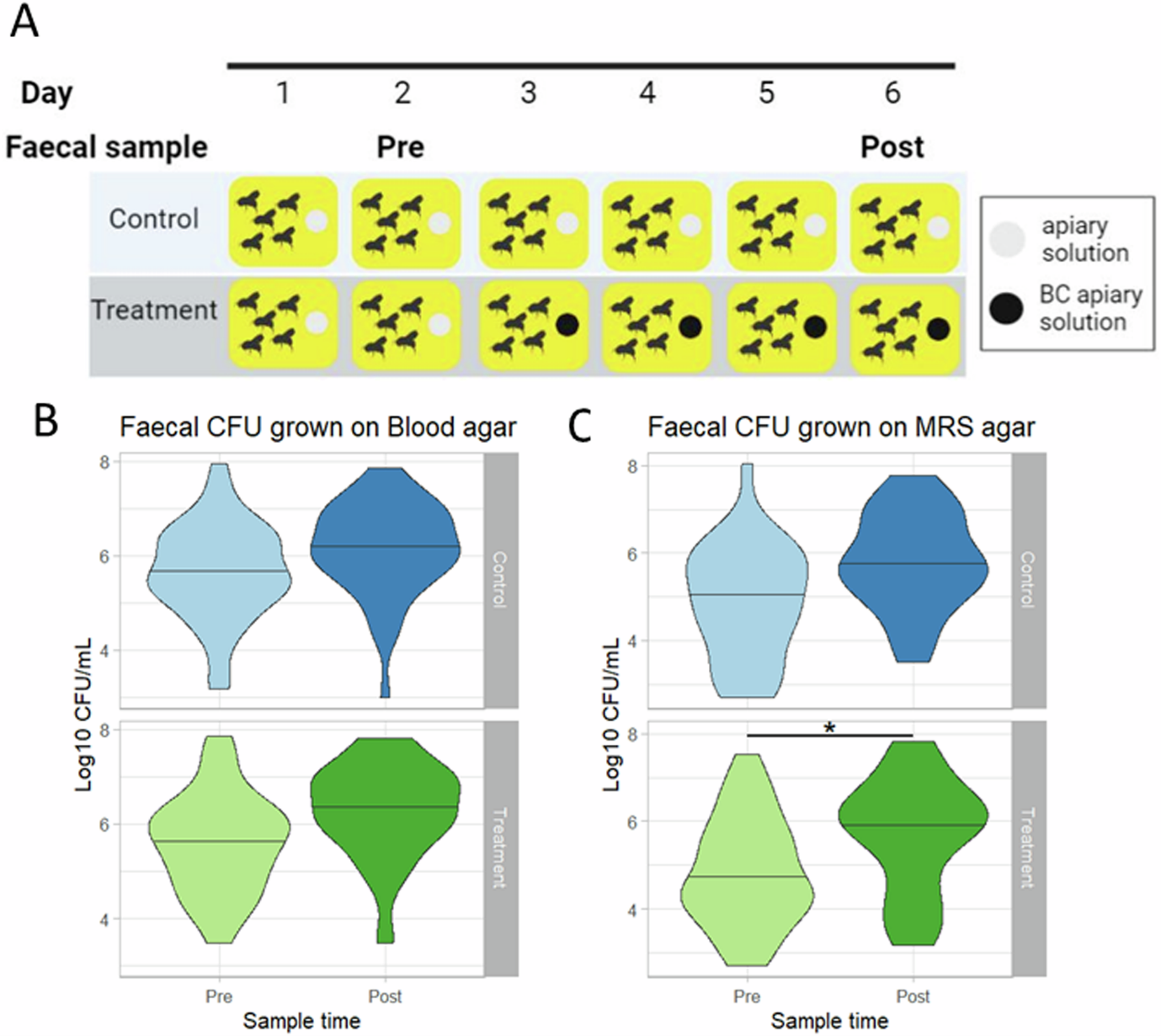 A) Experimental setup showing example experimental boxes, feeding patterns with apiary solution or black carbon (BC) apiary solution and sample collection across a daily period. Bumblebee faecal samples grown on blood agar (B) or MRS agar (C).