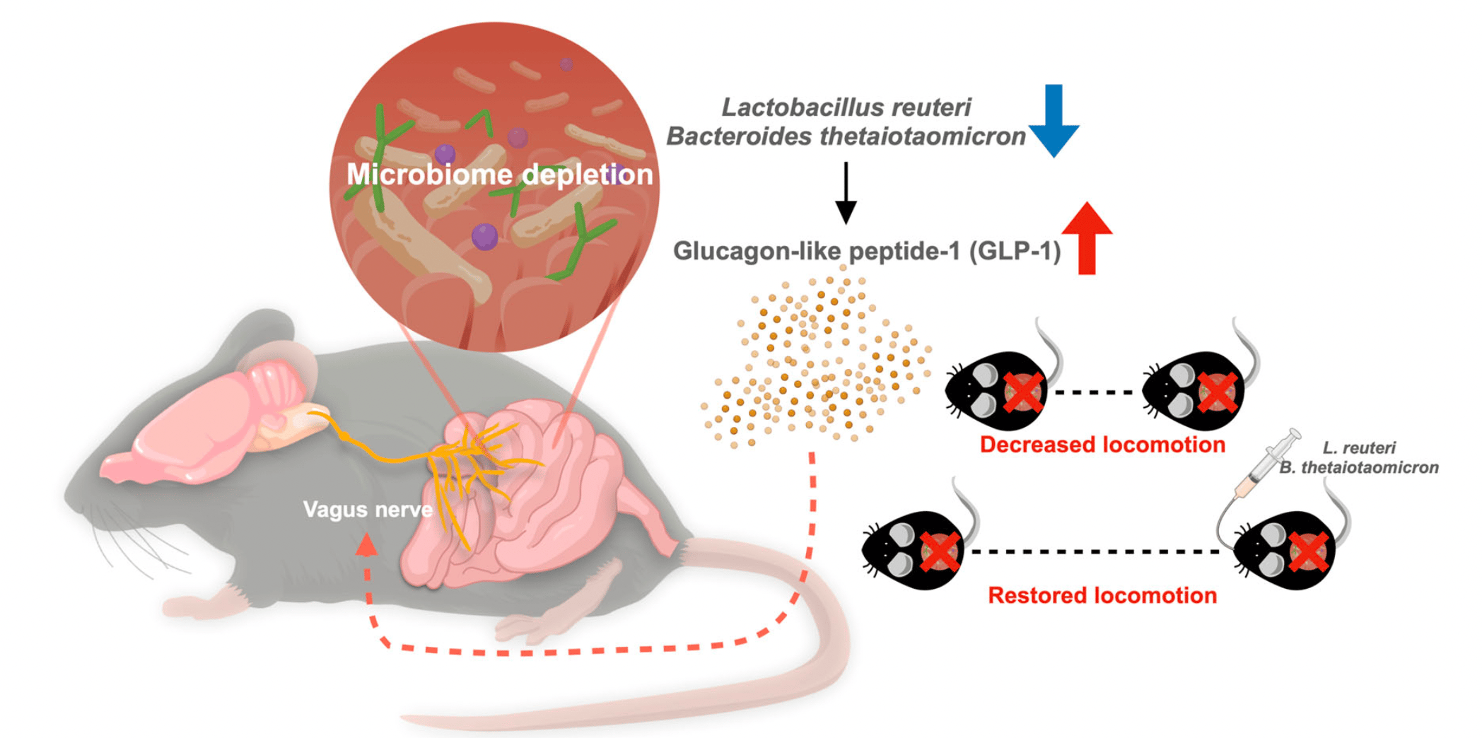 Another objective we try to explore is to pinpoint specific bacteria influencing GLP-1 levels. After observing the GLP-1 levels in response to different selective antibiotics, only two types of antibiotics led to significantly increased GLP-1. The sequencing of 16S ribosomal RNA in the fecal samples from selective antibiotic-treated mice revealed the alterations in bacterial composition between different antibiotic groups. We identified bacterial species, Lactobacillus reuteri and Bacteroides thetaiotaomicron, which are correlated with GLP-1 levels in the selective antibiotic-treated groups. Finally, we colonized the microbiota-depleted mice with the two bacterium candidates. Remarkably, we observed a reduction of GLP-1 levels and a restoration of locomotor activity. It appears that we identify the puppeteers controlling the host locomotor behavior. Our study demonstrates that the specific microorganism orchestrates locomotor activity via the GLP-1 signaling and the vagal-dependent pathway.