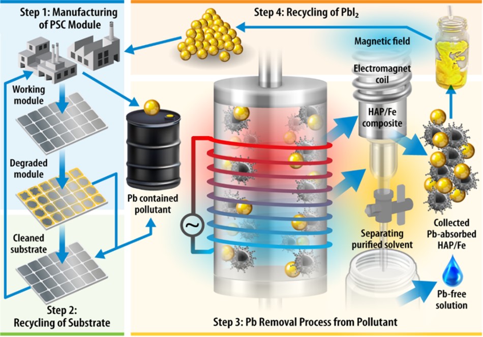 In addition, we have figured out a facile strategy to reach zero-Pb-pollutant policy in PSC market; Pb-based law materials such as PbI2, that are main chemical for perovskite, were recollected by Pb-adsorbed HAP composites using solubility difference between HAP and PbI2. HAP particles generally can be fully dissolved in acidic solution, but PbI2 shows low solubility in water, even acid solution. We confirmed that the recycling yield of Pb raw materials from Pb containing pollutant is reached up to 99.97% using this reprecipitation process, and recycled PbI2 is comparable in quality to commercial PbI2. Thus, the Pb management process in our study enables a zero-lead-emission process for future lead-based perovskite manufacturing.