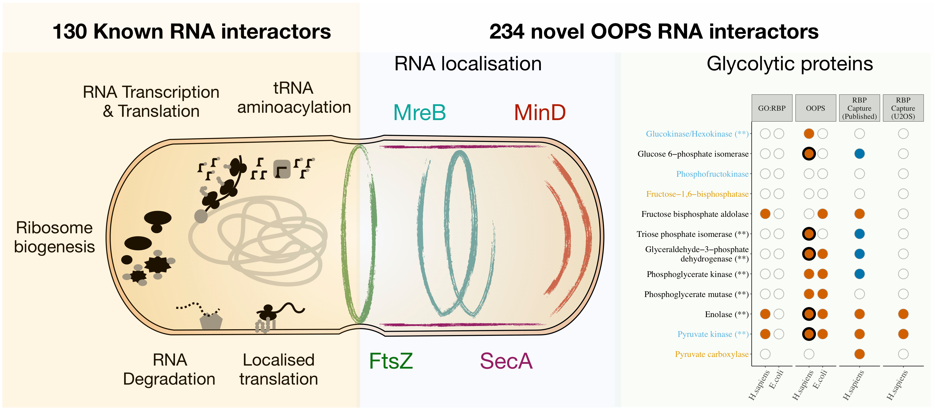 In addition to these known interactors, we discovered 234 potentially novel RBPs, suggesting OOPS could yield new findings when applied to species which have been neglected by previous methods. For example we identified glycolytic enzymes previously shown to interact with RNA in mammals, and proteins with intriguing subcellular distributions such as MreB, MinD and SecA, which could conceivably coordinate RNA localisation, a process that has been proposed recently to occur in microbes, but which has not been widely studied. Of course, confirming the function of this proteins when interacting with RNA will require further experimentation, but we are confident that we have uncovered many new protein-RNA interactions. OOPS could be immediately applied to other model systems and important human pathogens to further our understanding of pathogen cellular biology and host-pathogen interactions. We are currently using OOPS as a start point for multiple downstream applications which we hope will aid comprehensive and dynamic studies of RNA-protein interactions in all species.