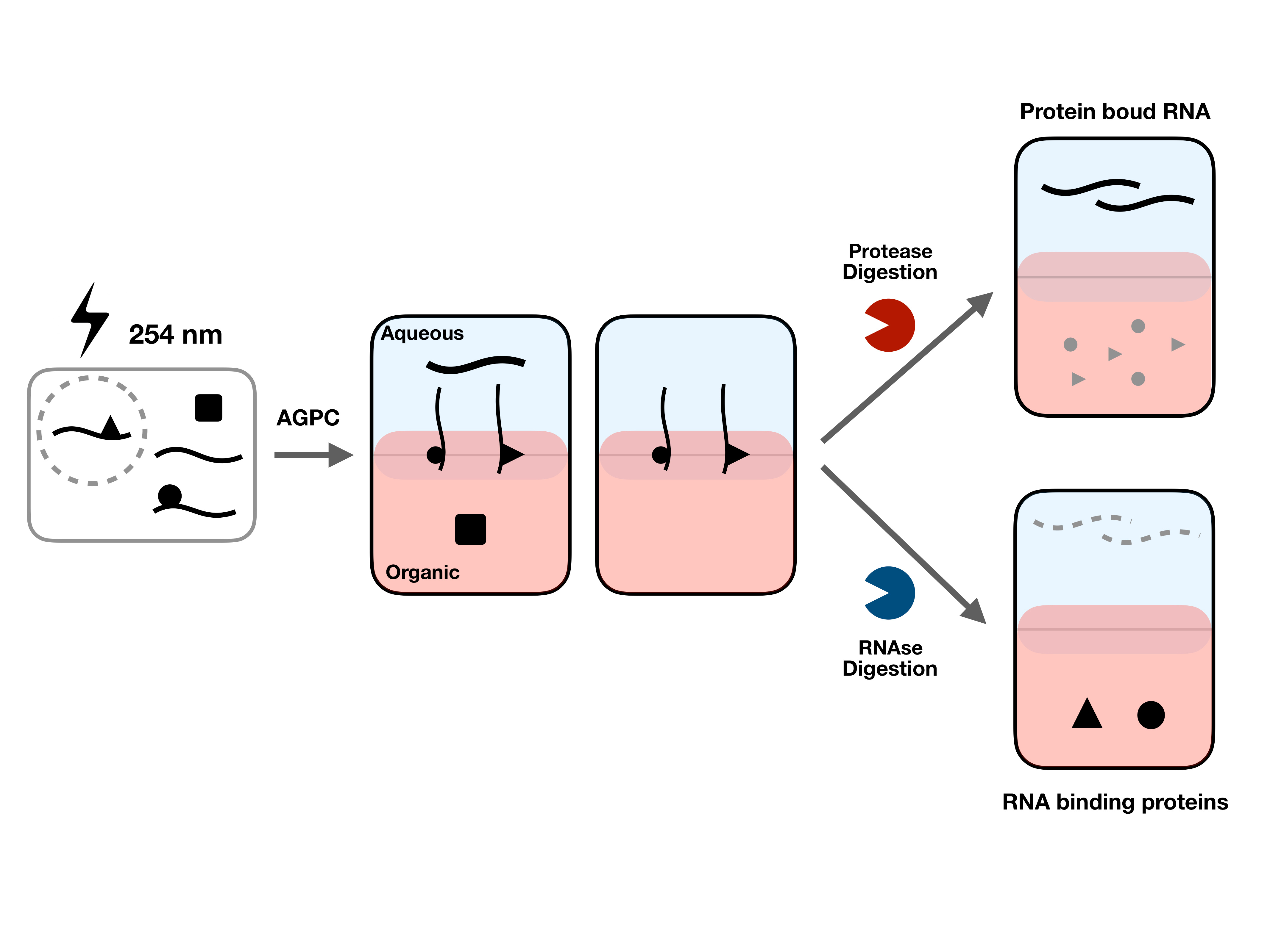 If you work on RNA, it’s likely that you will have used acid guanidinium thiocyanate-phenol-chloroform (AGPC), commonly referred to as the “TRIzol protocol” after the branded reagent, to extract RNA from your samples. Under acidic conditions, denatured protein are soluble in organic solvents, whereas RNA is soluble in aqueous solutions. Mixing cell lysates with AGPC, followed by centrifugation therefore yields two phases: an upper aqueous phase containing RNA and a lower organic phase containing protein. Protocols for this method usually caution against taking any material from the interface between the phases on the basis that it may contain DNA, lipids or carbohydrates: “here be dragons”. We had the idea to flip the method on its head and instead extract protein:RNA complexes from the AGPC interface, on the basis that the two components will “pull” towards the opposite phases, leaving the complex at the interface. To capture RNA-bound protein, we first had to fix their interactions in place as non-covalent interactions are lost when the protein is denatured. We chose to do this with 254 nm UV, which is commonly used to crosslink RNA and protein at zero distance, without the need to incorporate modified nucleotides such as 4-thiouridine.
