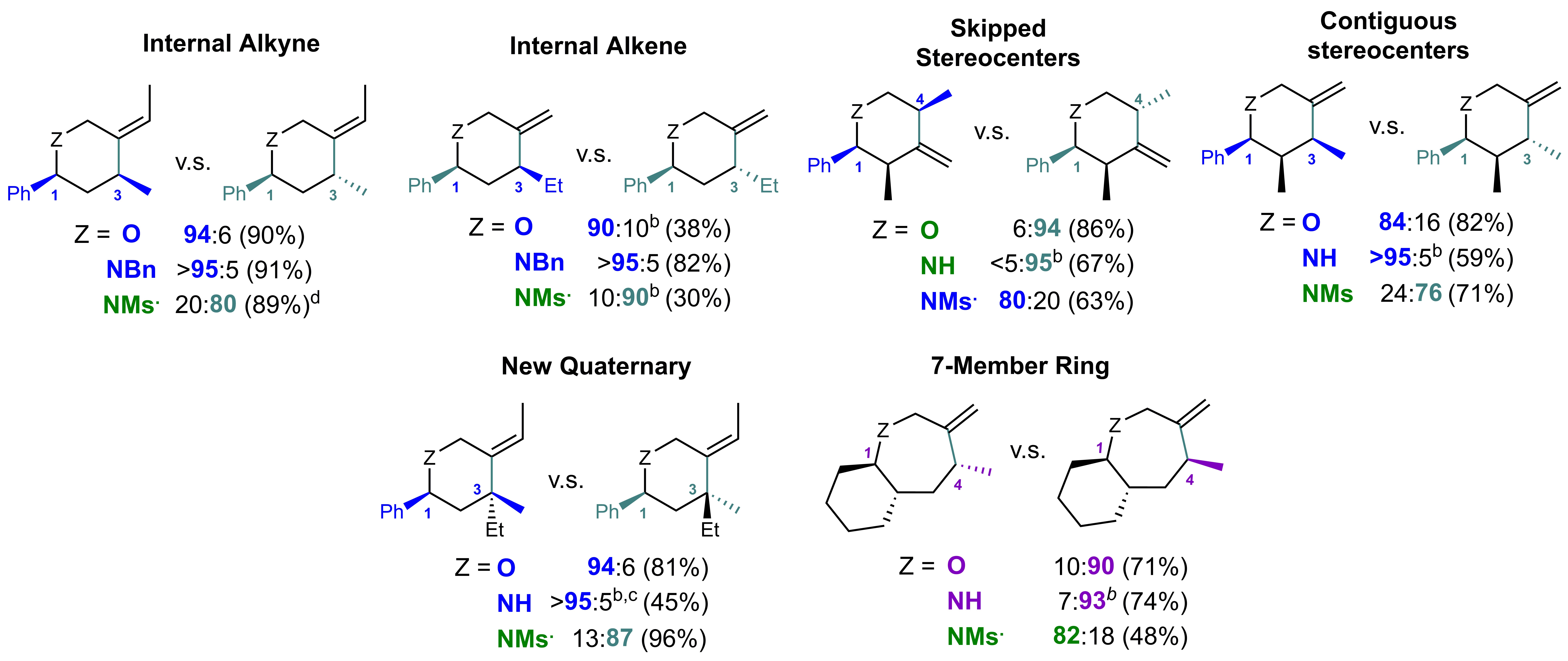 The diastereodivergent synthesis also came with a broad scope of heteroenynes. Enynes with aryl and alkyl substitutions, with internal alkenes and alkynes, with nearby stereocenter interference at b-position, with gem-disubstituted alkenes and with a longer chain length, are all good substrates, which provided an new entry to synthesis heterocycle derivatives with higher substituted olefins, longer side chains, 1,2,3-contagious and 1,2,4-skipped stereocenters, new quaternary centers, and 7-member heterocycles. Notably, it offers a possible entry to build stereodefined quaternary carbon centers only having marginal steric differences (e.g., Me vs Et).