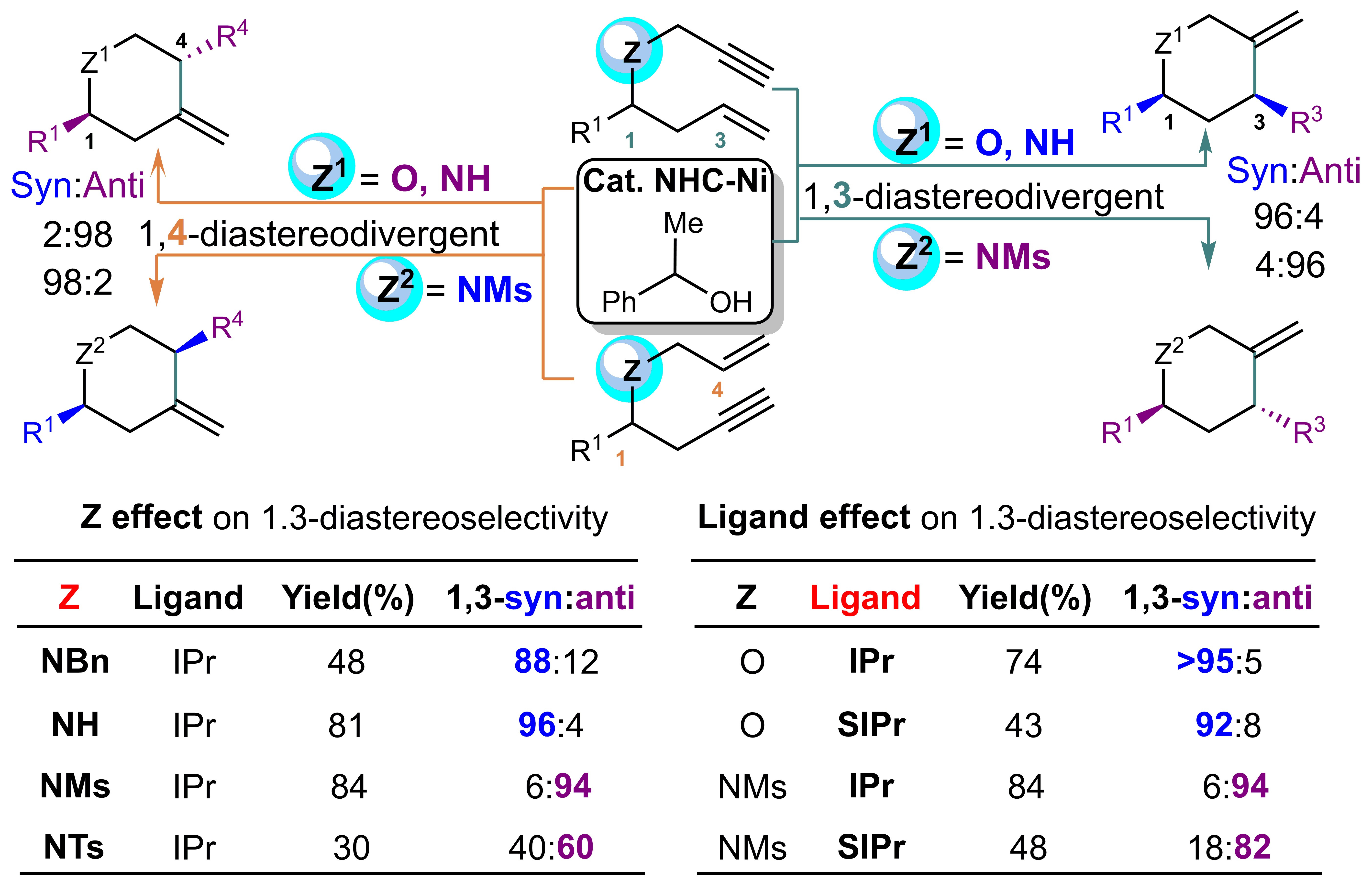 Overall, by tuning property of Z on enynes, a highly predicable and tunable 1,3- and 1,4-diastereodivergent heterocycle synthesis was established under the catalysis of NHC-Ni(0). The diastereodivergent efficiency seems largely governed by Z directed nickelacyclopentene forming step at the start, which makes it have a great potential in joining many other transformations which based on metallacyclopentenes and related species for broader scope.
