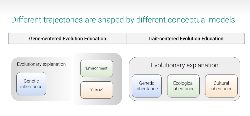Critically, however, we as scientific experts and educators must first get on the same page regarding the multitude of conceptual implications that arise from the more generalized and interdisciplinary framing of evolutionary processes that the niche construction concept would suggest is necessary. Just take the basic concept of inheritance. Young students intuitively develop some conception that different traits are caused differentially by both genetic and cultural inheritance. So, how should an evolution educator engage these intuitive concepts of inheritance? As we argue, there are now two conflicting schools of thought in the evolution education research community, a gene-centered model and a trait-centered model (see figure 1). In a gene-centered evolution education model, we tend to emphasize to students that genetic inheritance is the relevant stream of inheritance for evolutionary explanations, with genes of course interacting with the "environment" and perhaps "culture". In a more interdisciplinary, trait-centered model of evolution education, we would emphasize the similarities, differences, and interactions among all streams of heritable information: among them genetic, ecological, cultural.