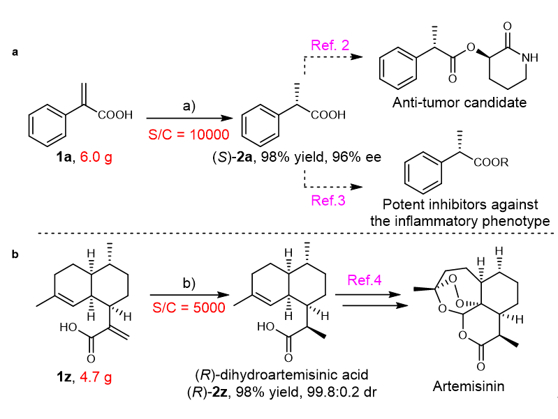 To further evaluate the activity of the catalyst and applicability of this catalytic system, the catalyst loading was first tested. To our delight, the model substrate 1a, in the presence of a much lower catalyst loading (1/10000), was reacted completely on a gram scale to give 2a in 98% yield and 96% ee (Fig. 3a). To the best of our knowledge, this result represents the highest TON (turnover number) for the Ni- catalyzed asymmetric hydrogenation of olefins reported to date. Dihydroartemisinic acid (R)-2z is the key intermediate for preparing Artemisinin, which is one of the most effective drugs for the treatment of malaria. Thus, the asymmetric hydrogenation of artemisinic acid (1z) was conducted using this catalytic system. Fortunately, 1z was reduced completely to give dihydroartemisinic acid (R)-2z with 98% yield and 99.8:0.2 dr, even at a 0.020mol% catalyst loading (S/C= 5000), indicating the potential of this methodology for industrial application (Fig. 3b).
