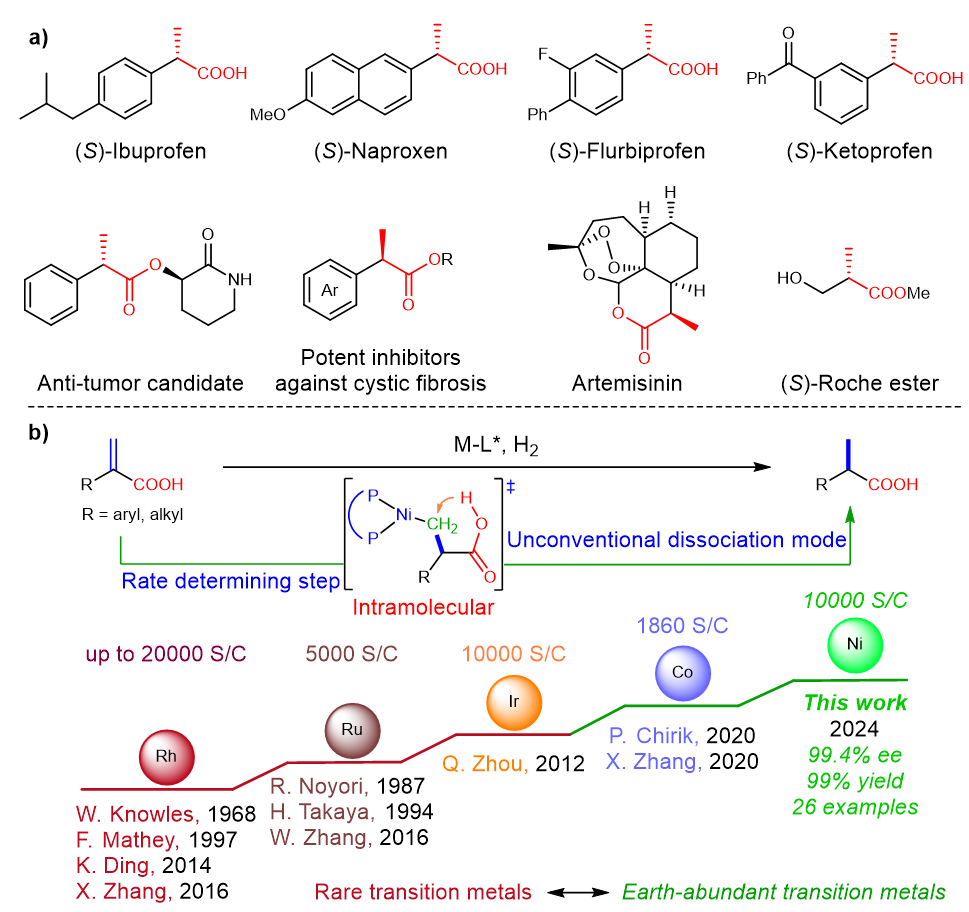 Chiral α-substituted propionic acids serve as crucial scaffolds in the pharmaceutical and chemical industries. They act as key intermediates in the synthesis of various biologically active compounds, including anti-inflammatory drugs like (S)-Ibuprofen and (S)-Naproxen, as well as the antimalarial drug Artemisinin (Fig. 1a). Historically, the asymmetric hydrogenation of α-substituted acrylic acids to prepare chiral α-substituted propionic acids has been dominated by catalysts based on rare and expensive metals such as rhodium, ruthenium, and iridium (Fig. 1b). Despite their effectiveness, these approaches are unsustainable due to the high cost and scarcity of these metals. Nevertheless, research on using earth-abundant metal catalysts remains inadequate in the academic and industrial contexts (Fig. 1b).1-3