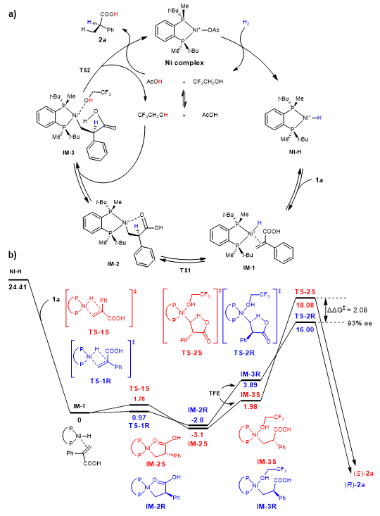 In order to explore a possible mechanism, we conducted several deuterium-labelling experiments. These experiments revealed that α- and β-H in the products mainly originate from both H₂ and the protic solvent, respectively. Next, DFT calculations showed that the hydrogenation involves the formation of a Ni-H complex, which coordinates with the substrate's C=C bond, followed by a reversible migratory insertion and a rate-determining protonolysis step from the carboxylic acid group (Fig. 4). Kinetic studies confirmed the reaction mechanism, highlighting the essential role of the carboxylic acid proton. Control experiments with acids, bases, and esterified substrates further verified this, demonstrating the necessity of the carboxylic acid group for the reaction's success. Additionally, IGMH analysis indicated that weak interactions stabilize the transition states, enhancing enantioselectivity.