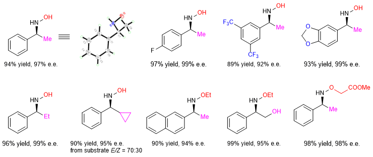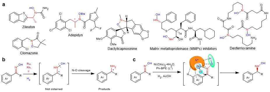 Transition metal-catalyzed asymmetric hydrogenation provides a convenient and practical method to prepare optically pure molecules from prochiral unsaturated compounds. This methodology has been widely applied to the industrial synthesis of key intermediates of pharmaceuticals and other bioactive compounds as recognized by the Nobel prize awarded to Knowles and Noyori. However, the efficient asymmetric hydrogenation of oximes for the preparation of the corresponding chiral hydroxylamines has remained a great challenge over a half century despite these products being vital chiral molecules (Fig. 1a). Most efforts targeted at the catalytic reduction of oximes to hydroxylamines produce only primary amines as a result of the cleavage of a weak N-O bond (Fig. 1b). This is because that in addition to the intrinsically low reactivity of the C=N bond of oximes, the N−O bond can be readily ruptured under reduction conditions due to the repulsion between the lone pairs of both the N and O atoms of the N−O group. A compromised strategy to overcome this drawback is the use of the relatively stable oxime ether as the substrate. Nevertheless, only two catalytic systems have been applied in the hydrogenation of oxime ethers without the cleavage of the N-O bond (reported by Oestreich and Cramer groups).1-2