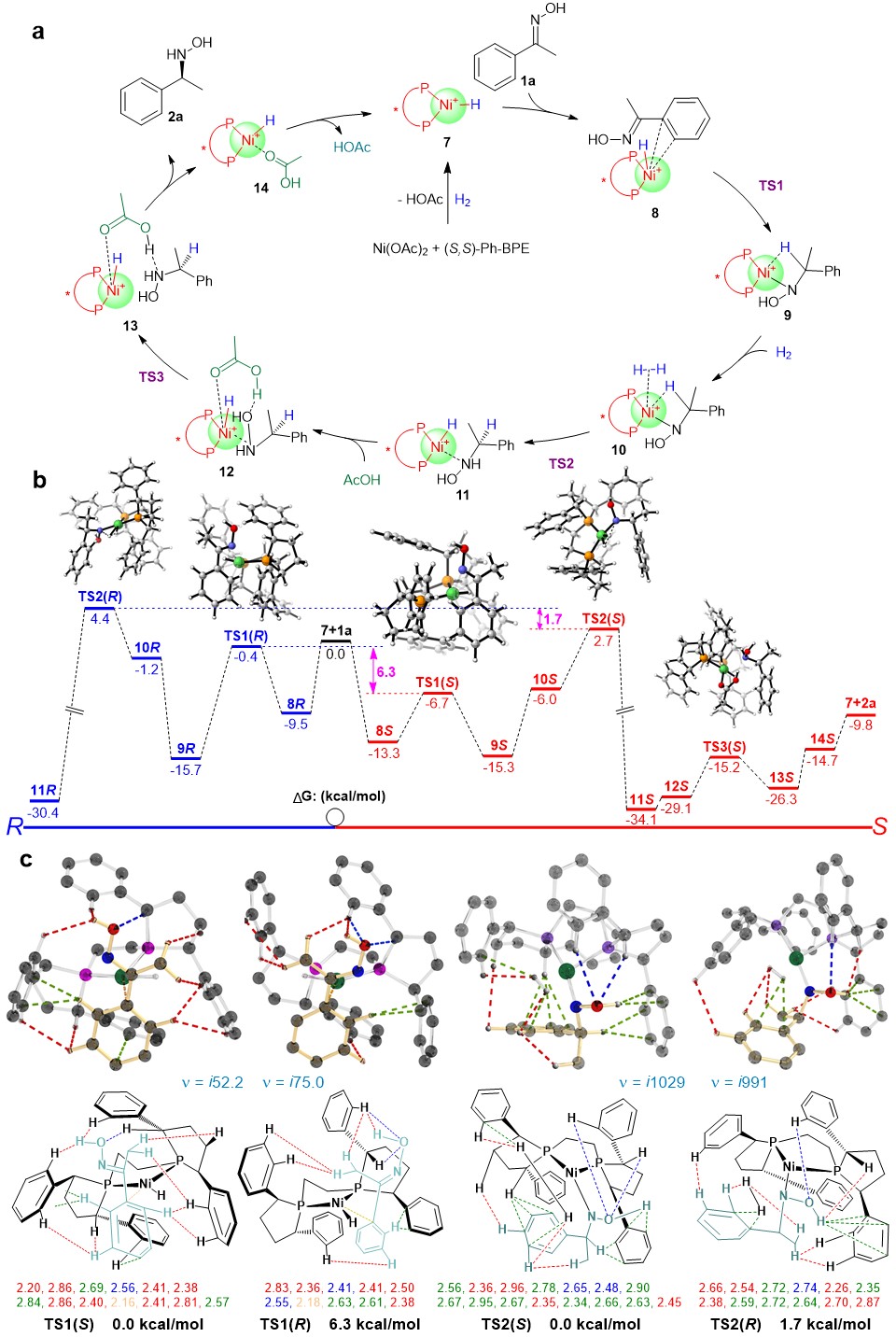 Fig. 3. | Computed mechanism. a, The catalytic cycle. b, Energy profiles. c, Transition states.