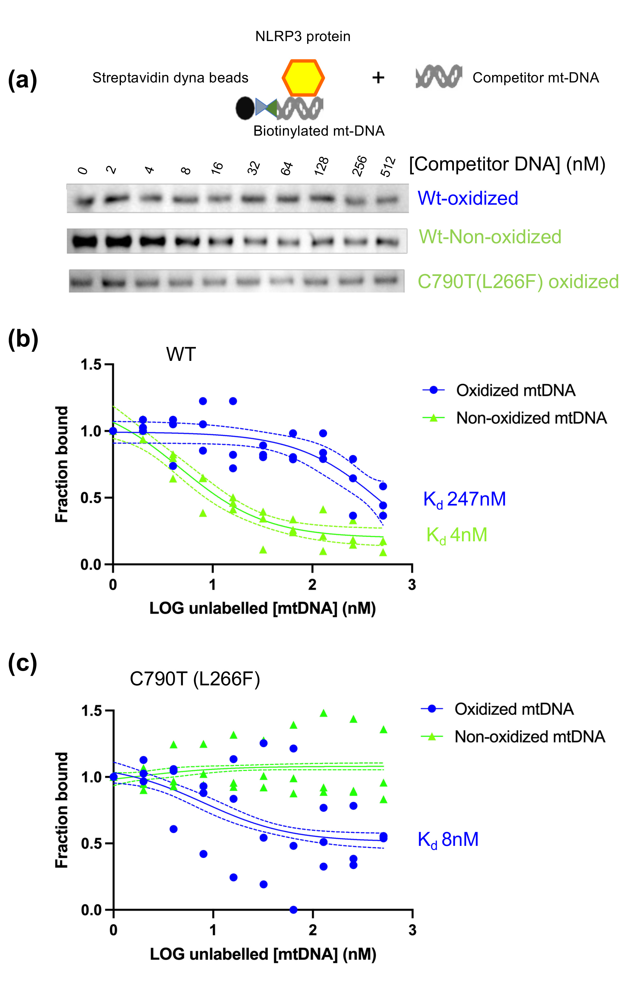 Fig. 1 NLRP3 elutes with unlabeled oxidized and non-oxidized competitor mtDNA. (a) NLRP3 was eluted from biotinylated oxidized or non-oxidized mtDNA coated streptavidin dynabeads with increasing concentrations of unlabelled oxidized or non-oxidized mtDNA (schematic). A representative gel of each membrane of each shown (n=3). (b) and (c) Fraction bound vs. LOG unlabeled mtDNA for elution with oxidized or non-oxidized mtDNA. Raw data plotted. Dashed line represents 95% confidence interval of best fit line (solid line), n=3.