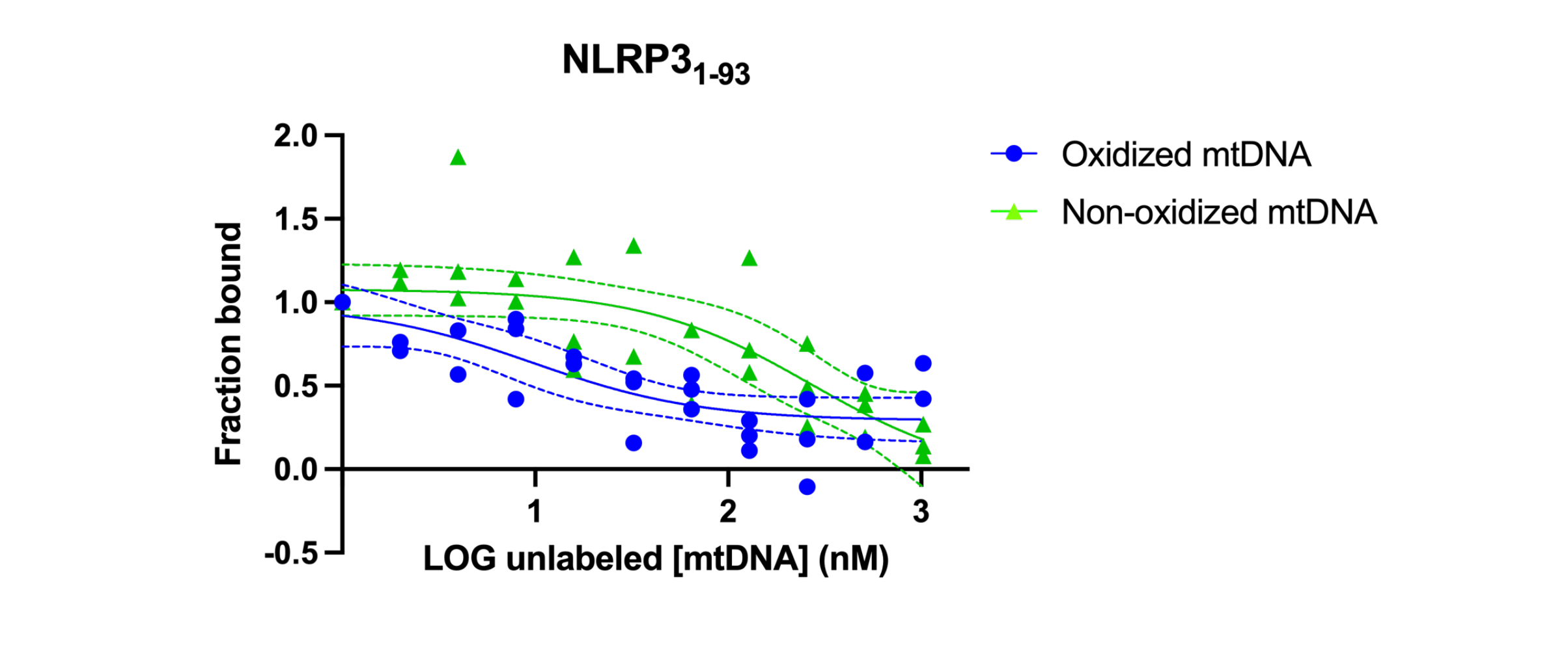 Fig. 3 Pyrin Domain of NLRP3 prefers oxidized over non-oxidized mtDNA. Fraction bound vs. LOG unlabeled mtDNA for elution with oxidized or non-oxidized mtDNA. Raw data plotted. Dashed line represents 95% confidence interval of best fit line (solid line), n=3.