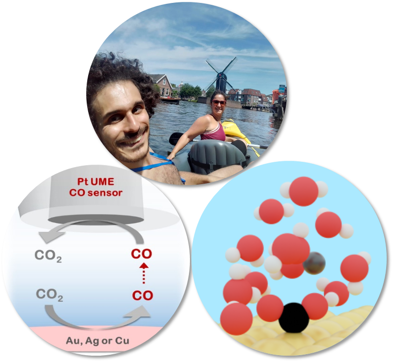 The story we told so far already existed before the kayaking trip around Leiden... but some pieces of the puzzle and deeper understanding were still missing. Luckily, the trip was long enough that an experimentalist and a theoretician had plenty of time to talk, about both the beautiful canals, and science. New fundamental understanding usually follows disruptive experimental evidence, such as the trigger role of metal cation to enable electrochemical CO2 reduction. To get as close as computationally possible to the experimental system, we apply Density Functional Theory (DFT)-based ab initio Molecular Dynamics (AIMD) at room temperature on a 1.5 nm × 1.5 nm Au(111) supercell with 72 water molecules.7 We insert one alkali cation between Li+, Na+, K+, and Cs+ close to the surface and, after 2 ps, we let a CO2 molecule adsorb on the surface. The presence of cations in solution leads to a three-fold effect. First, such cations coordinate with CO2 during AIMD, with Li+ coordinating less often to the adsorbate, and Cs+ coordinating continuously. Upon coordination, this short-range M+–OCO interaction stabilizes CO2 adsorption by around 0.5 eV. Secondly, the OCO angle decreases from 180º to 140º due to this cation stabilizing effect indicating activation. Thirdly, the cation enhances the first electron transfer from the catalytic surface to adsorbed CO2. Thus, our modeling confirms that metal cations open the CO2 reduction pathway to the first reaction product, CO. As an ultimate consequence of these results and recent investigations,8 we then propose a novel CO2 to CO reaction mechanism involving a metal cation to enable CO2 adsorption and first electron transfer, and water as the proton donor.