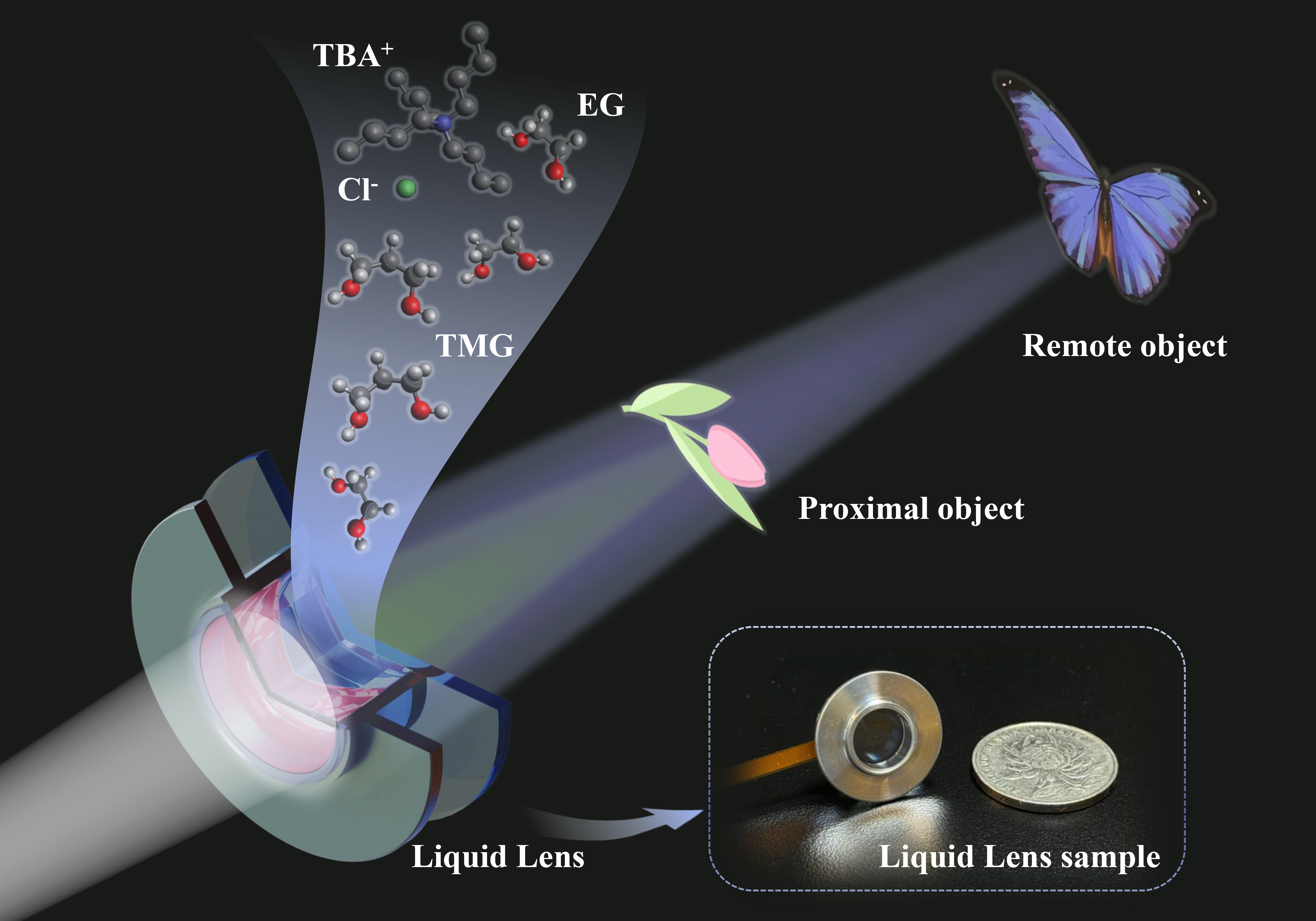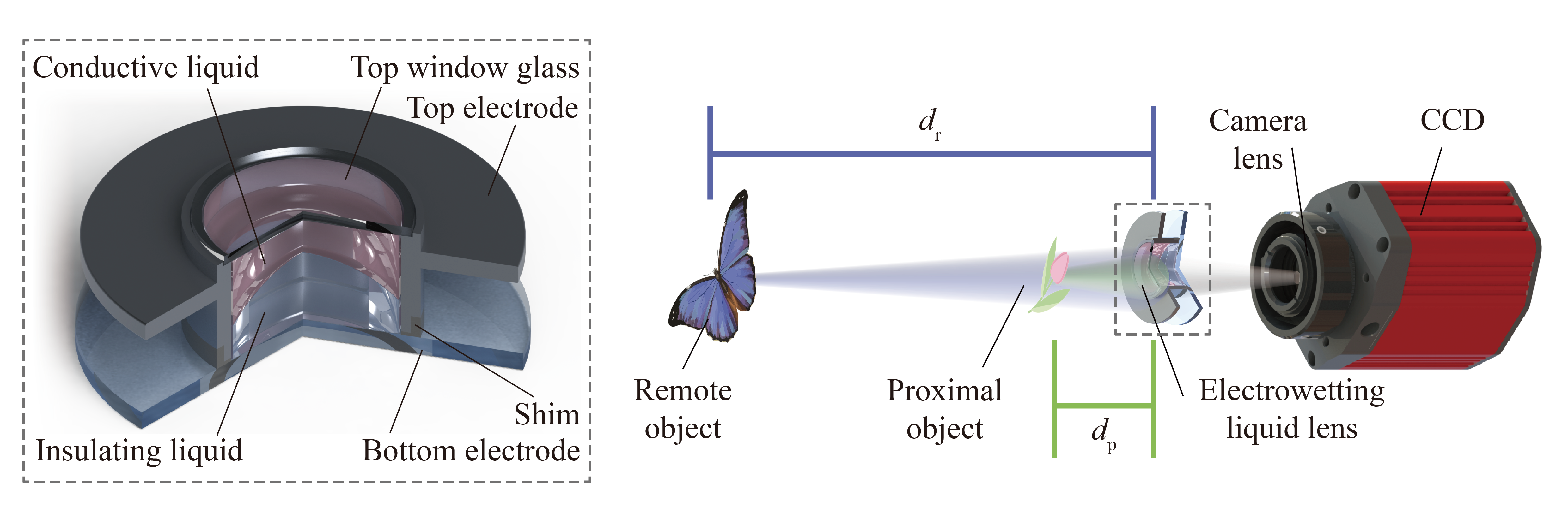 Figure 1 Concept diagram and sample of the proposed centimeter-level large-aperture non‑aqueous electrowetting lens.