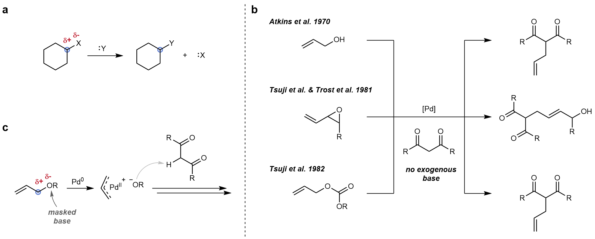 Figure 1 a: The two basic primary functions of electrophiles exemplified in a generic substitution reaction, i.e. an appropriate bond polarization (red) and the localisation of the bond forming site (blue). b: Seminal studies in the field of allylic substitution reactions that inspired the concept of non-innocent electrophiles. c: Allyl electrophiles carrying a masked base which is released upon oxidative addition.