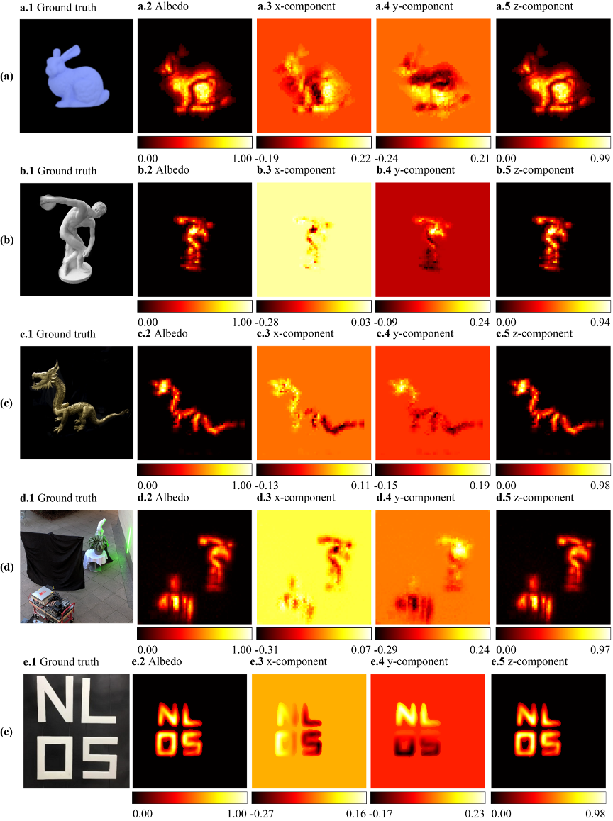 Reconstructed albedo and surface normal of different scenarios. (a) Synthetic, confocal, from Zaragoza dataset (http://graphics.unizar.es/nlos_dataset.html) (b) Measured, confocal, indoor, from Stanford dataset (http://www.computationalimaging.org/publications/nlos-fk/) (c) Measured, confocal, indoor, from Stanford dataset (http://www.computationalimaging.org/publications/nlos-fk/) (d) Measured, confocal, outdoor, from Stanford dataset (http://www.computationalimaging.org/publications/nlos-fk/) (e) Measured, non-confocal, indoor, from the dataset provided by the phasor field method (https://biostat.wisc.edu/~compoptics/phasornlos20/fastnlos.html).