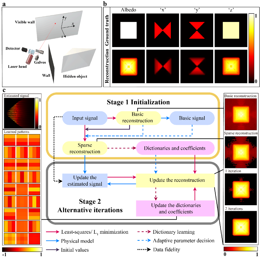 Schematic of NLOS layout and the proposed SOCR reconstruction algorithm. a To reconstruct the unseen object, some light sources are used to illuminate a visible wall. The photons bounced back from the object are detected at several points on the visible wall. b Ground truth and our reconstruction. The x, y and z components are displayed in their absolute values. c Flowchart of the proposed framework. The estimated signal and the learned patterns of the target are shown on the left. Reconstructed albedo is shown on the right.