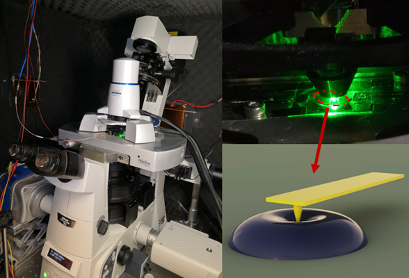 Figure 1. Experimental setup. Left: AFM-confocal correlation microscopy. Right upper: Photo of the setup during measuringment. Right lower: Scheme of the nanoindentation on a gelatin particle.