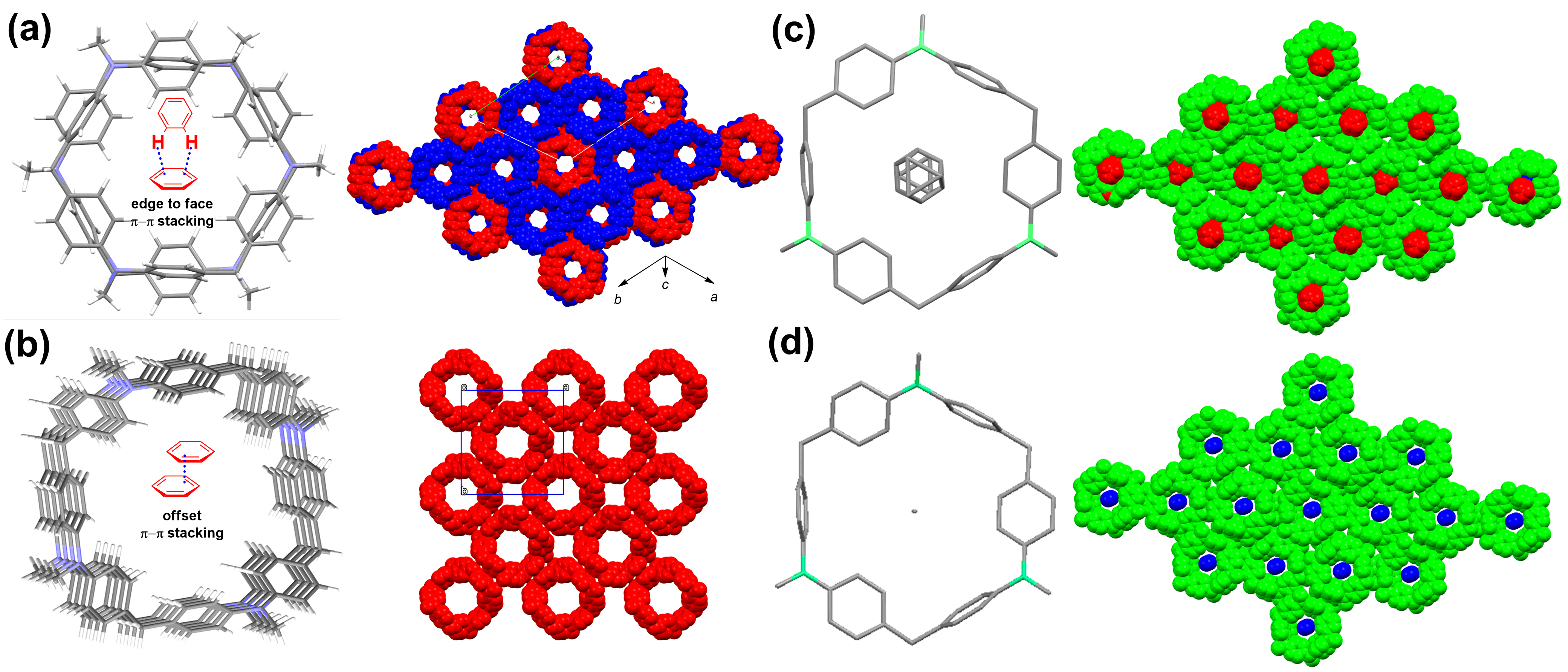 Figure 2. Intermolecular interaction and crystal packing of DPA[3] (a) and DPA[4] (b). X-ray crystal structure and 3D packing of DPA[3]⊃ethene (c) and DPA[3]⊃ethyne (d).