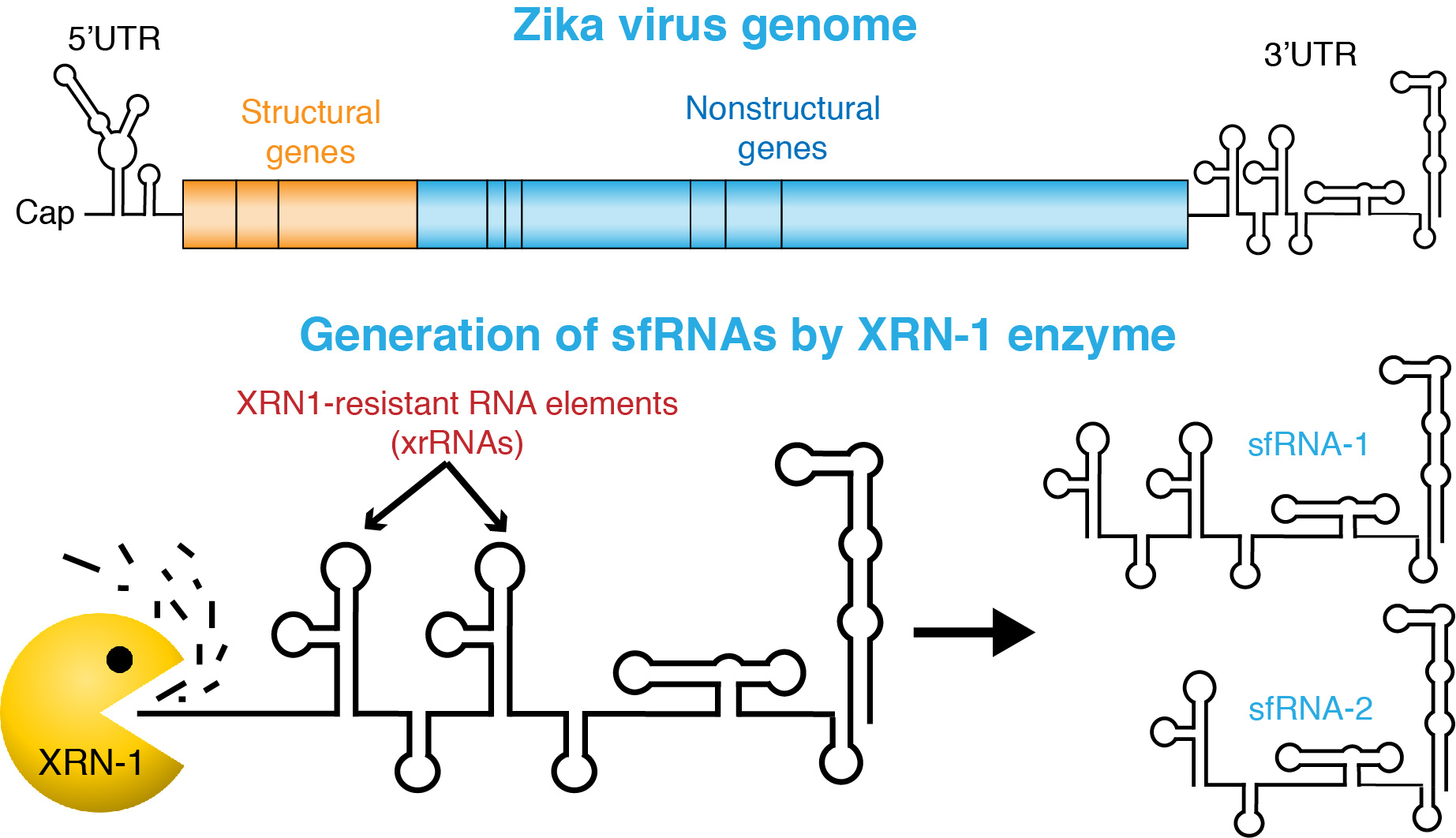 Organisation of Zika virus genome and production of sfRNAs via incomplete degradation of genomic RNA by host enzyme XRN-1.
