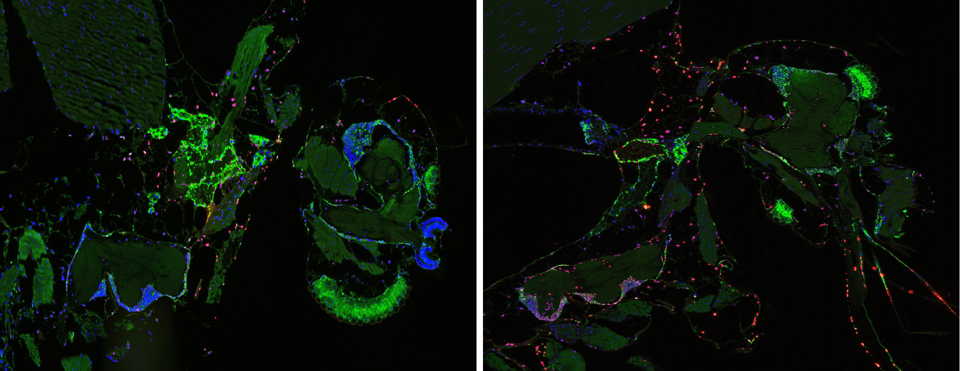 Apoptotic cells (red) and Zika virus (green) in heds and thoraxes of mosquitoes infected with wild type virus (left) and sfRNA-deficient virus (right).