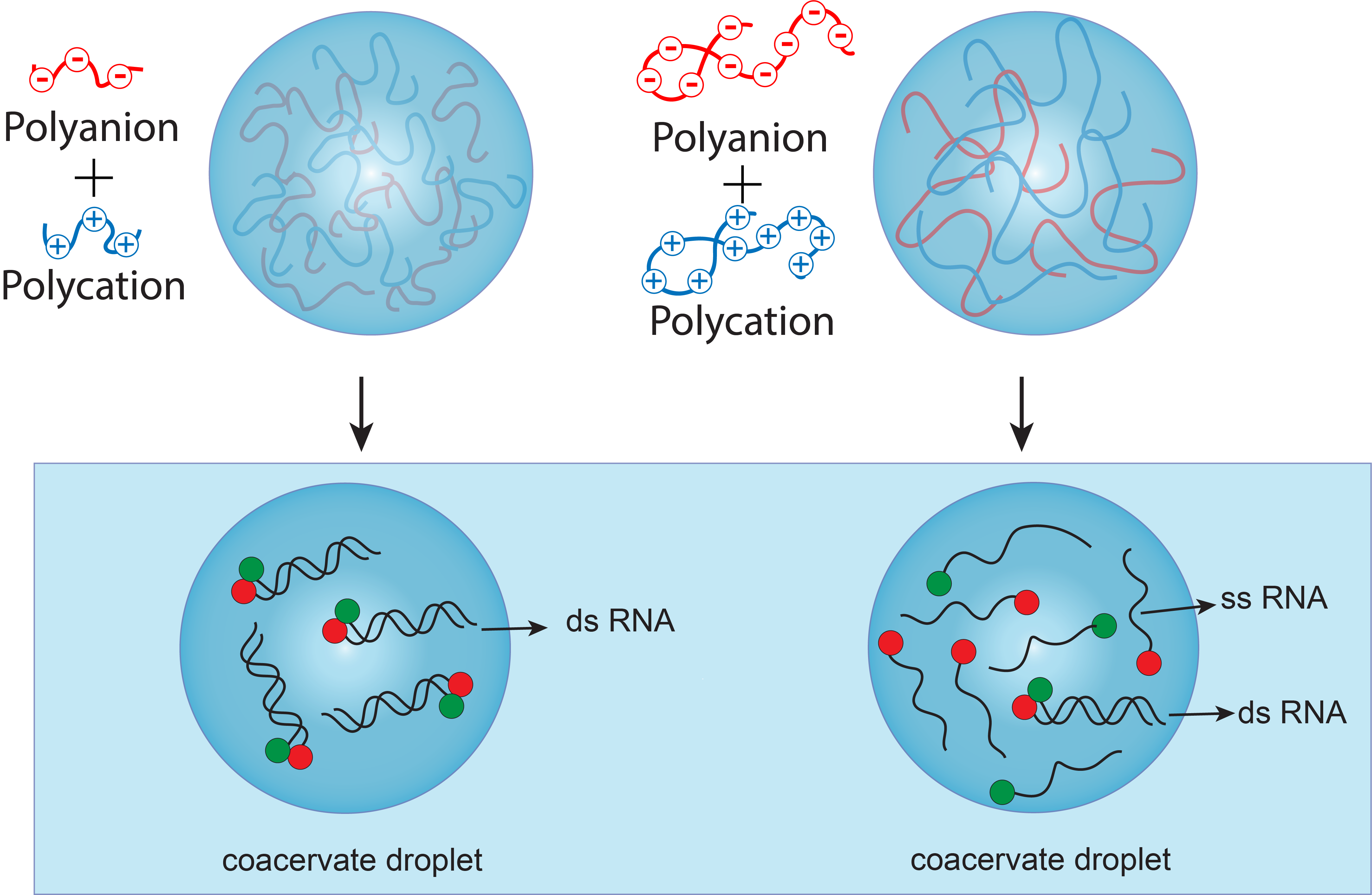 Phase separation can occur when oppositely charged biomolecules are mixed, leading to a dense polymer-rich phase (called the "condensate" or coacervate phase) and a dilute polymer-deficient phase, which exist in equilibrium. These condensates look like water droplets on your window on a rainy day. The term coacervation was first coined in 1929 by Bungenberg de Jong and Kruyt.1 Their potential role in the beginnings of life was highlighted by biochemist Alexander Oparin, who wrote “The important thing is that a number of phenomena displayed by coacervates, as well as by protoplasm, are determined by the same physico-chemical causes… so that a knowledge of the coacervate is a very essential landmark in the evolution of our appreciation of the physico-chemical properties of the protoplasm” in his essential book The Origin of Life (1936).2 It is no coincidence that collaborative NASA-funded research on the origin of life under the supervision of Professors Christine Keating and Philip Bevilacqua at Penn State was undertaken by utilizing compartment models, including coacervates.