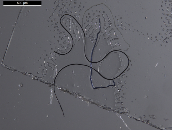 A blue anthropogenic fibre, found in one of the shark species analysed in the study, likely originating from textiles.
