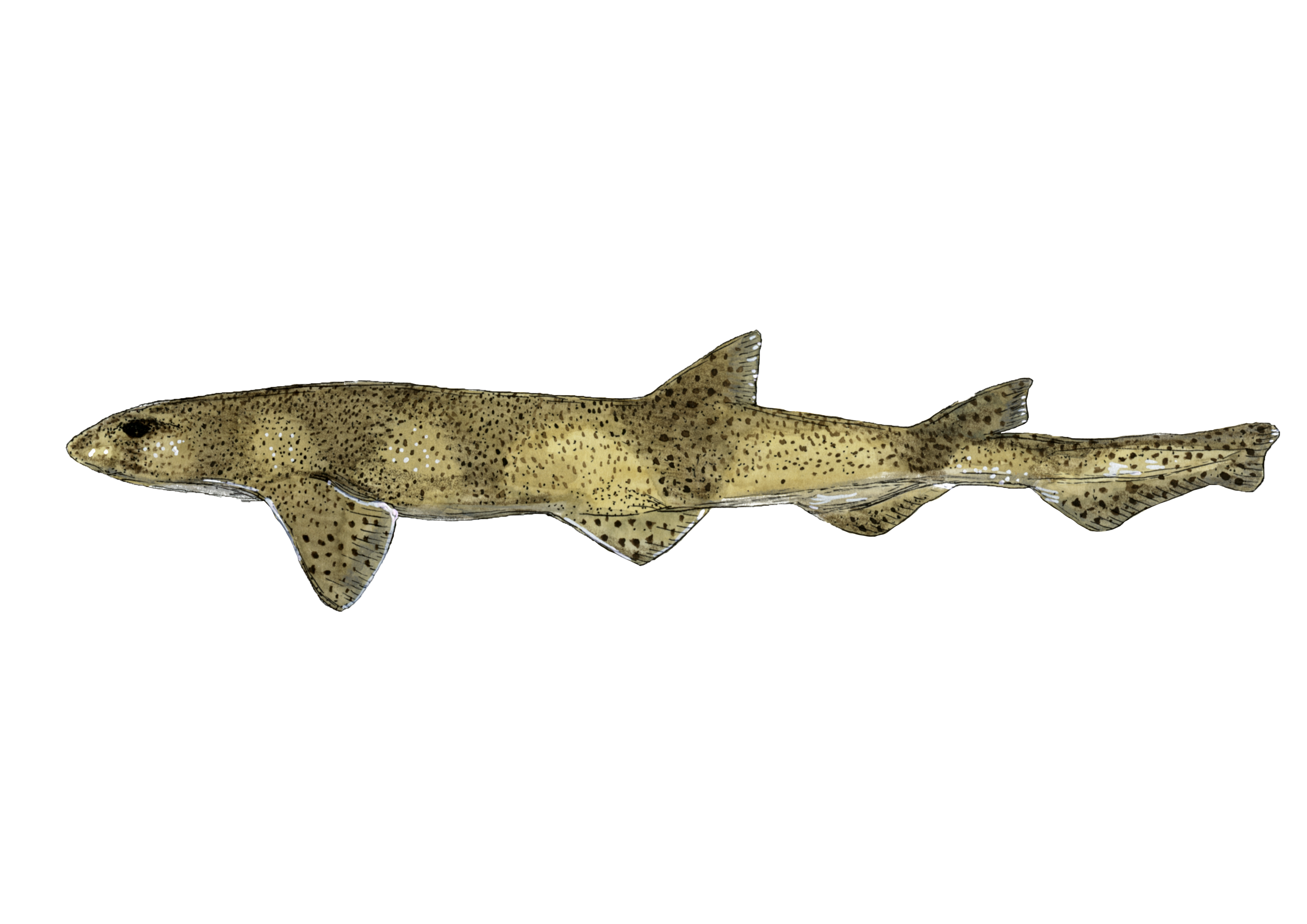 The lesser-spotted dogfish (Scyliorhinus canicula) is a commonly found demersal shark species across the British Isles. Illustration by Lucie Jones.