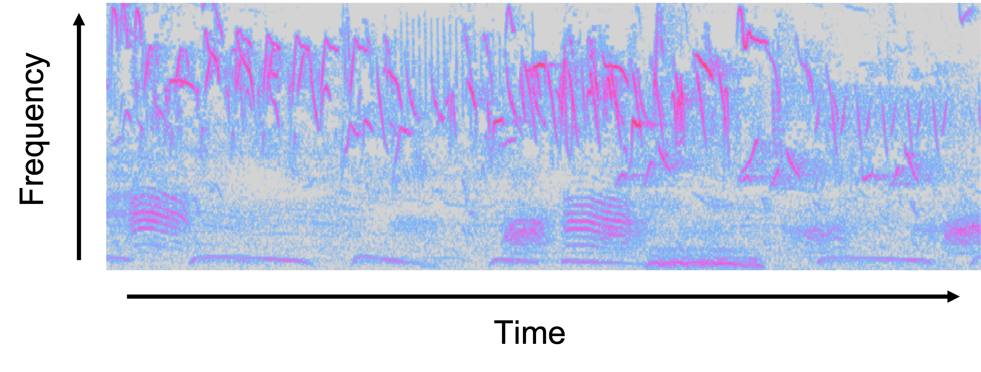 Figure 1: A spectrogram of multiple species singing – the x-axis represents time, the y-axis represents frequency which can also be thought of as the pitch or tone of a song. The amplitude, which represents energy or loudness, is shown by colour, with dark blues corresponding to lower amplitudes (quieter sounds) and brighter colours up through to pink corresponding to higher amplitudes (louder sounds).