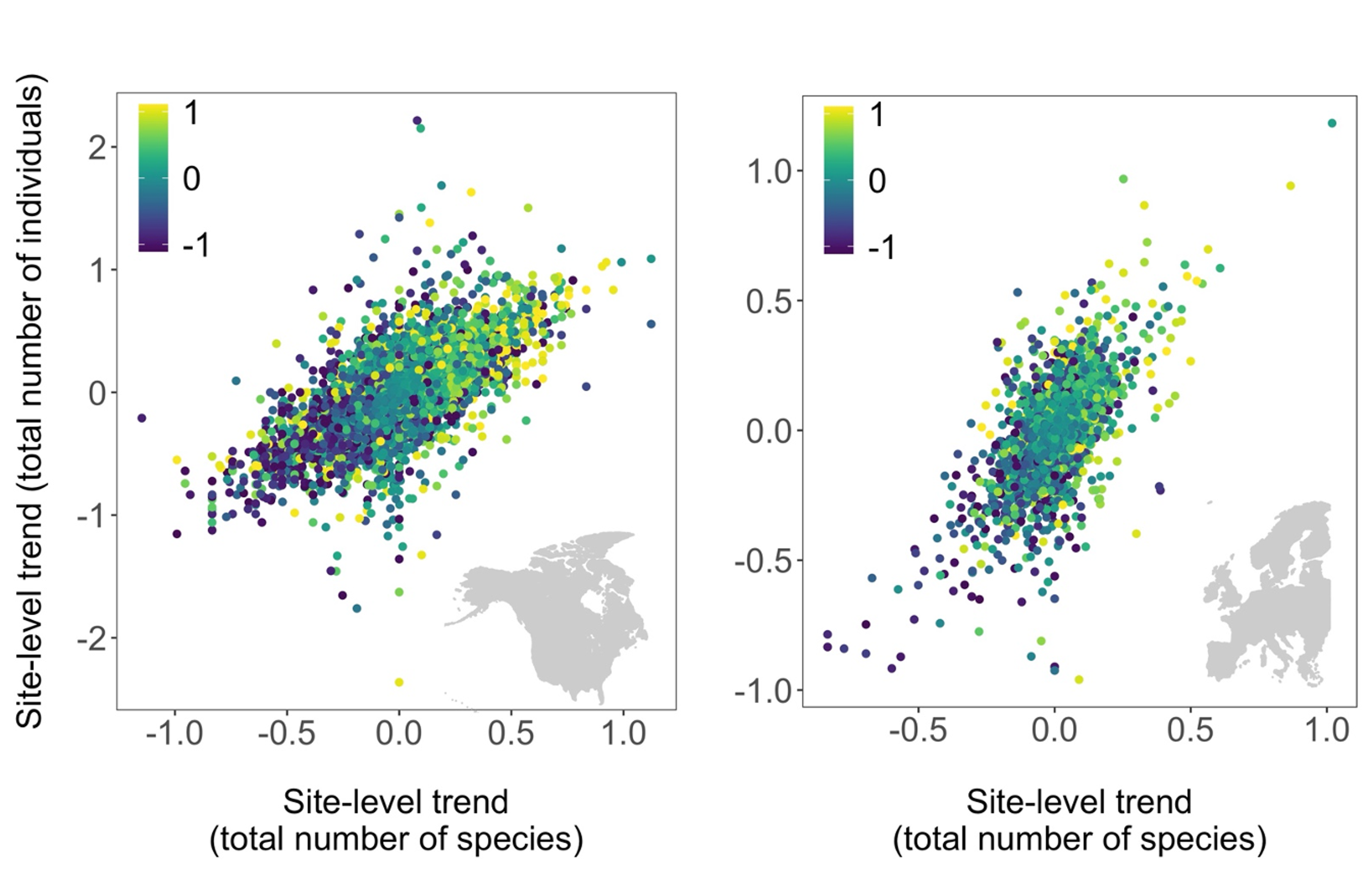 Figure 3: The association between site-level trends in the total number of species and the total number of individuals in 202737 NA-BBS sites across North America (left column) and in 16524 PECCBMS sites across Europe (right column). Colours indicate site-level trends in Acoustic Diversity Index, ADI, (yellow – improving soundscape quality; blue – declining soundscape quality). Sites that have experienced great changes in their bird communities tended to have also seen greater changes in the soundscape quality, although this was not always the case.