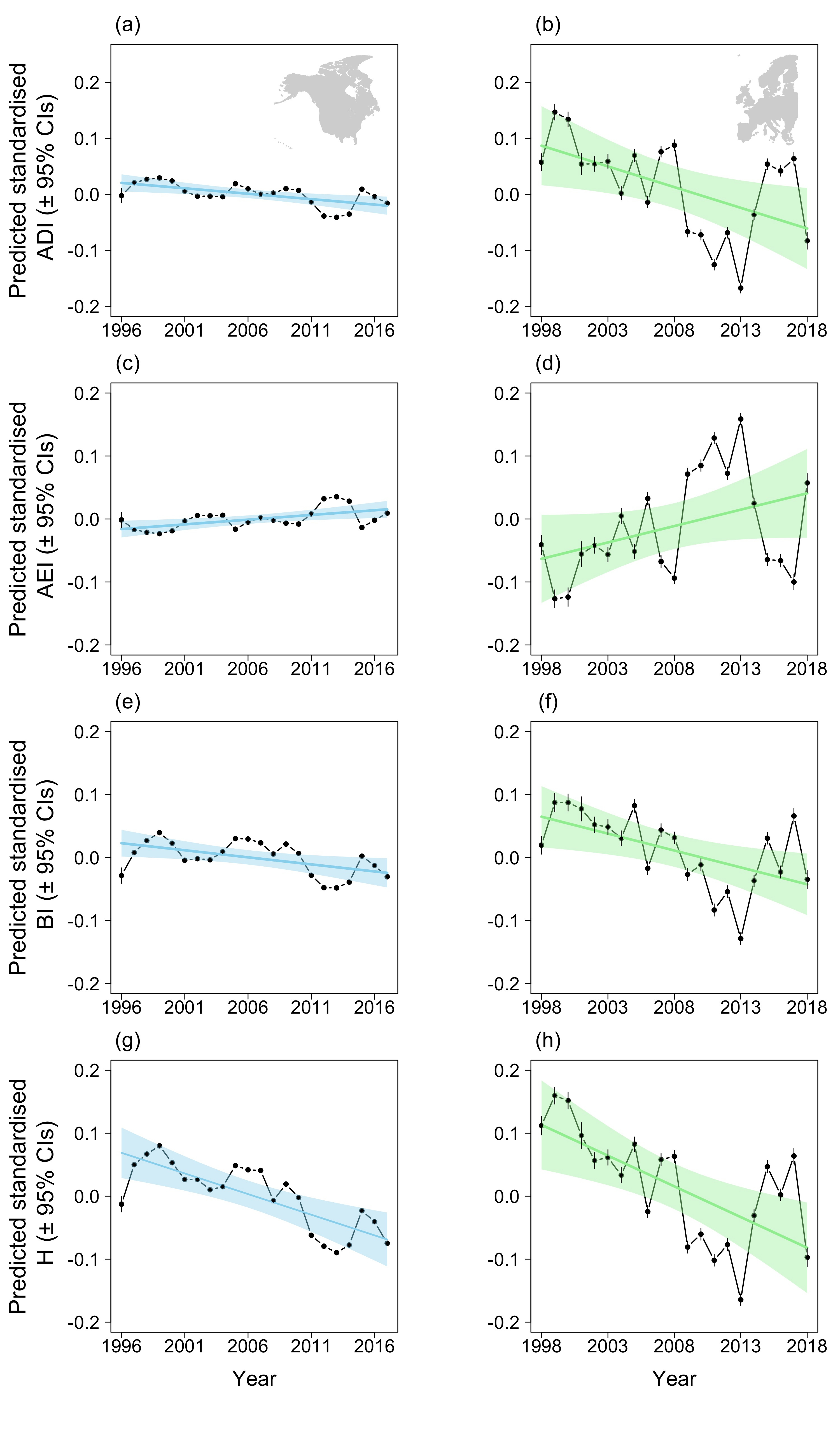Figure 2: Predicted annual variation in Acoustic Diversity Index, ADI (a,b), Acoustic Evenness Index, AEI (c,d), Bioacoustic Index, BI (e,f) and Acoustic Entropy, H (g,h) in North America (left column) between 1996 and 2017 and in Europe (right column) between 1998 and 2018. Declines in ADI, BI and H and increases in AEI, mean that the soundtrack of our spring has become quieter and less varied.