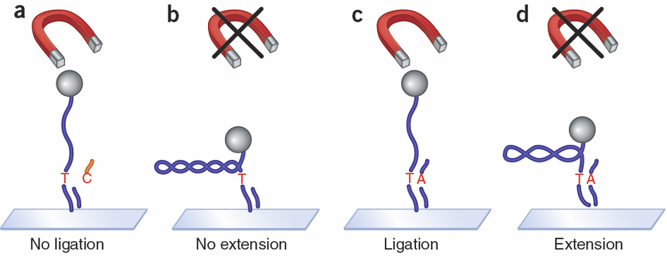 For further details on this new method, see the paper just published in this issue of Nature Methods (9(4), p367-372) [Update: this paper is now free to access for a week] and the News & Views piece by Sten Linnarsson in the same issue, from which the above illustration is taken. Another method for sequencing was also presented at the same time in the lab-on-a-chip meeting, using nanopore sensors for next generation DNA sequencing. Sadly my conference-going skills do not extend to splitting myself in half to be at two talks at once, so I was unable to hear about this new method in person as well!