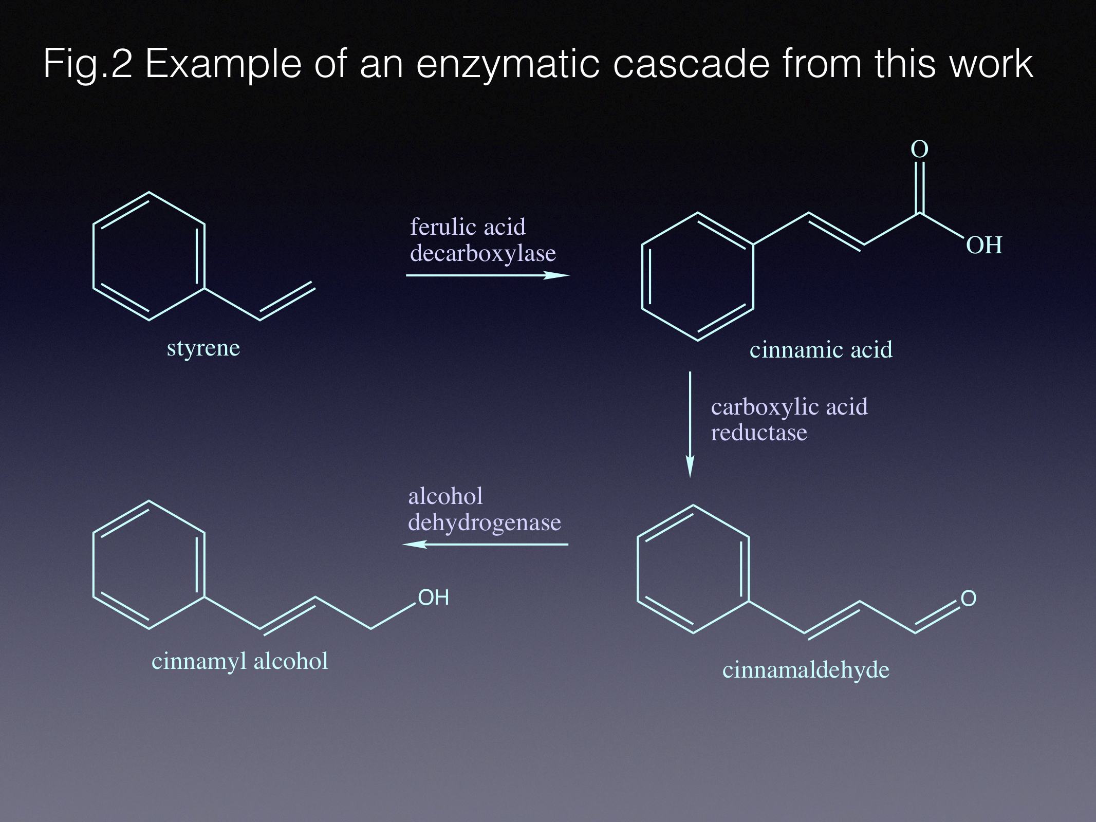 In this current paper we describe how we combined the Fdc1 (de)carboxylase with carboxylic acid reductase, ensuring the reaction equilibrium occurs in the carboxylation direction, achieving ambient CO2 fixation. In addition, we tested the enzyme with new (and more interesting!) substrates, and expanded the biocatalytic cascade to create aldehyde-, alcohol-, amide- and amine- derivatives. As expected, the initial yields of the new reactions were modest at best, and required protein engineering to widen the substrate scope.