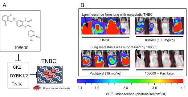 In our studies, 108600 suppresses growth of patient-derived xenograft (PDX) tumor grafts derived from patient cancers that responded poorly to standard chemotherapy like paclitaxel. 108600 as a single agent or in synergistic combination with chemotherapy dramatically inhibited growth of these chemotherapy resistant tumors by decreasing the ALDHhigh subpopulation within these tumors. This was consistent with our hypothesis that inhibiting CSCs sensitizes cancers to chemotherapy. As we aim to move toward clinical translation to early phase trials, we tested the efficacy of 108600 against established TNBC metastases in mouse models, a scenario that simulates stage 4 TNBC disease in patients. Remarkably, combined 108600 and paclitaxel nearly completely eliminated metastases, supporting the promising potential of 108600 as an effective therapy for patients with advanced disease.