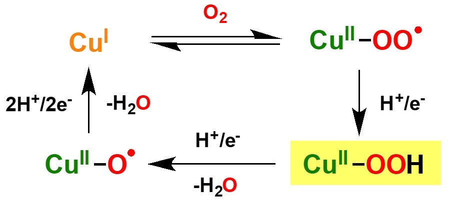 In nature, some enzymes have adopted the metal and oxygen to activate their catalytic cycle. The adopted metal and oxygen can be the metal-reactive oxygen species such as metal-superoxo, -hydroperoxo, -peroxo, and –oxo intermediates. The metal-reactive oxygen species have conducted the various functions depending on their own character. Among the metalloenzymes, peptidylglycine-α-hydroxylating monooxygenase (PHM) and dopamine-β monooxygenase (DβM) have been studied as representative copper-containing metalloenzymes. The mechanism of catalytic activation in PHM and DβM has been exhibited with the function of copper-superoxo, -hydroperoxo, and -oxyl radical species. Recently, lytic polysaccharide monooxygenases (LPMOs) have received much attention as enzymes, which directly oxidize the polysaccharide to the potential biomass. Although the accurate mechanism of LPMOs is still ambiguous, the study of mechanism and reactivity of LPMOs is in progress. Among the copper-oxygen species, especially, Cu(II)-hydroperoxo species has been believed in a crucial intermediate (Figure 1). It has been proposed that Cu(II)-hydroperoxo adducts were converted to Cu(II)-oxyl radical and water (in PHM and DβM) by an electron and proton transfer. In LPMOs, Cu(II)-hydroperoxo species also has been proposed that it reacts directly with the polysaccharide.