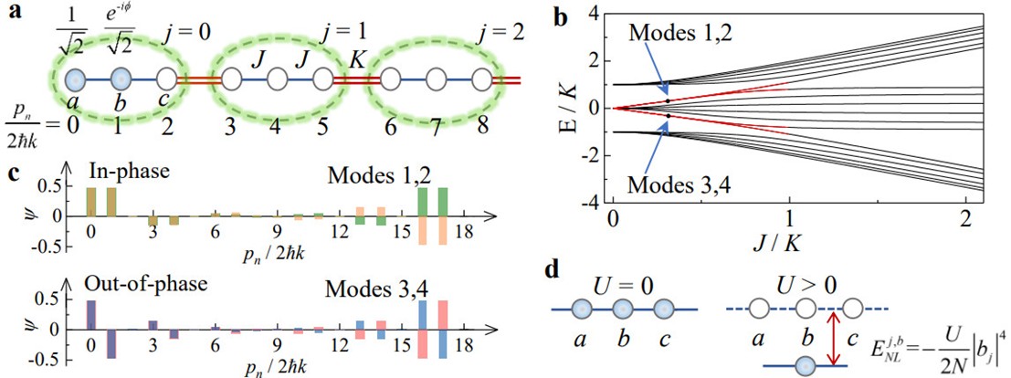 FIG. 1. Synthesizing topological atomic trimer array with tunable interaction. a, A topological trimer array is implemented in momentum lattices, based on the laser-driven Bragg transitions between the discrete atomic momentum states. The intra- and intercell hopping rates can be individually controlled by addressing each Bragg transition. Atoms are prepared at two leftmost sites with equal weight and a relative phase. b, Energy spectra of a trimer array in the noninteracting limit. The red lines represent topological edge states. c, Eigenmodes of topological trimer array correspond to the black dots in b. Two in-phase (out-of-phase) peaks characterize the modes 1 and 2 (modes 3 and 4). d, Illustration of the density-dependent, nonlinear energy induced by the atomic interactions.