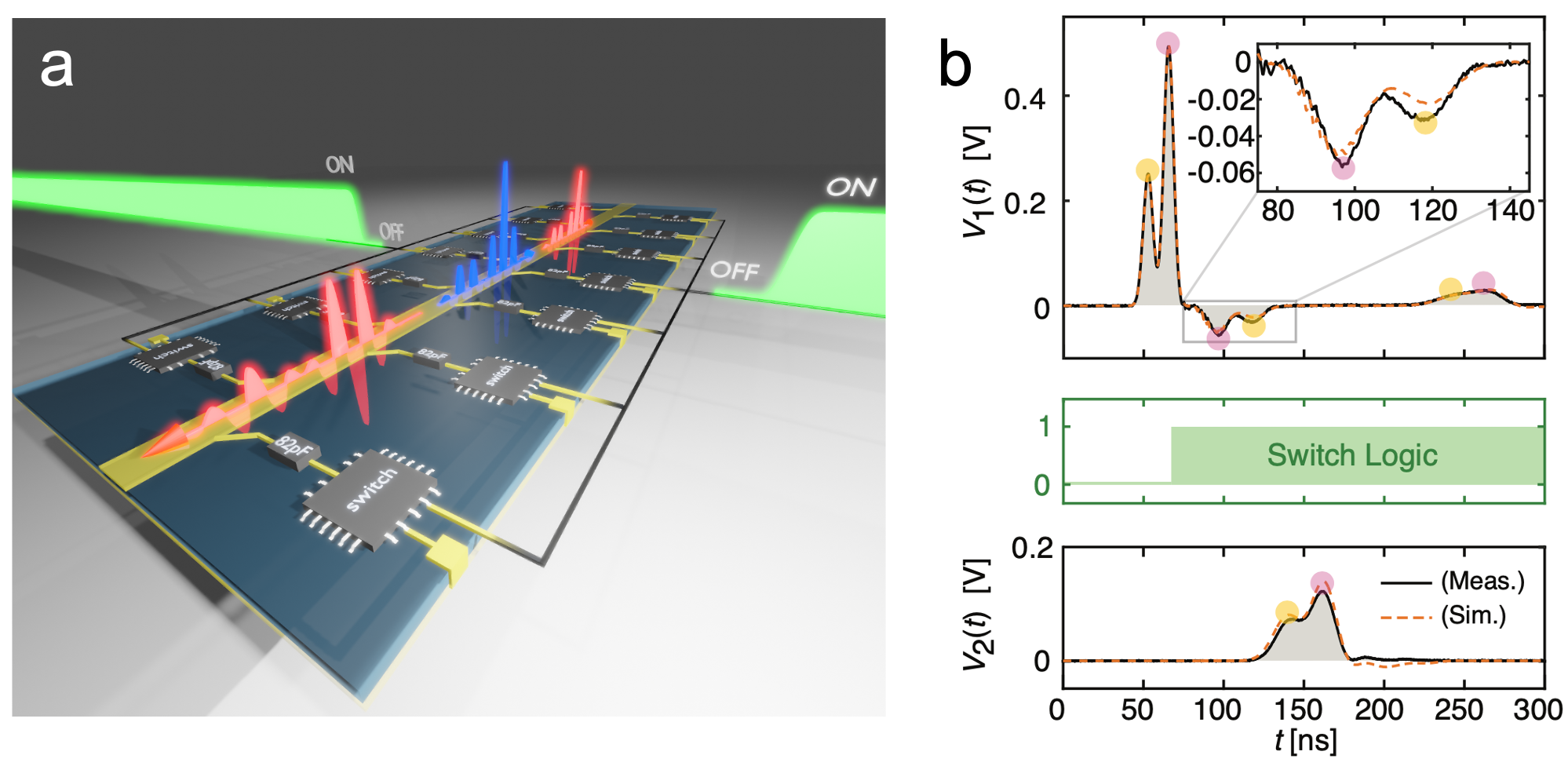 Fig 2. (a) Illustration of the experimental platform used to realize a time-interface. A control signal (in green) is used to uniformly activate a set of switches distributed along a metal line. Upon closing the switches, the line impedance of such tailored metamaterial is abruptly decreased, causing a broadband forward-propagating signal (in blue) to be partially time-reflected, (in red) and its frequency content redshifted. (b) Experimental observation of time-reflection of an asymmetric pulse consisting of a smaller input signal (yellow marker in input port voltage V1) followed by a larger one (purple marker). The middle panel depicts the switch logic, and the lower panel shows the time-refracted signal at the output port voltage V2. Both voltages are broadened in time due to the frequency translation, yet the time-reflected portion shown in V1 appears in time-reversed order (purple marker followed by the yellow one, as in the zoomed inset). Figures adapted from [2].