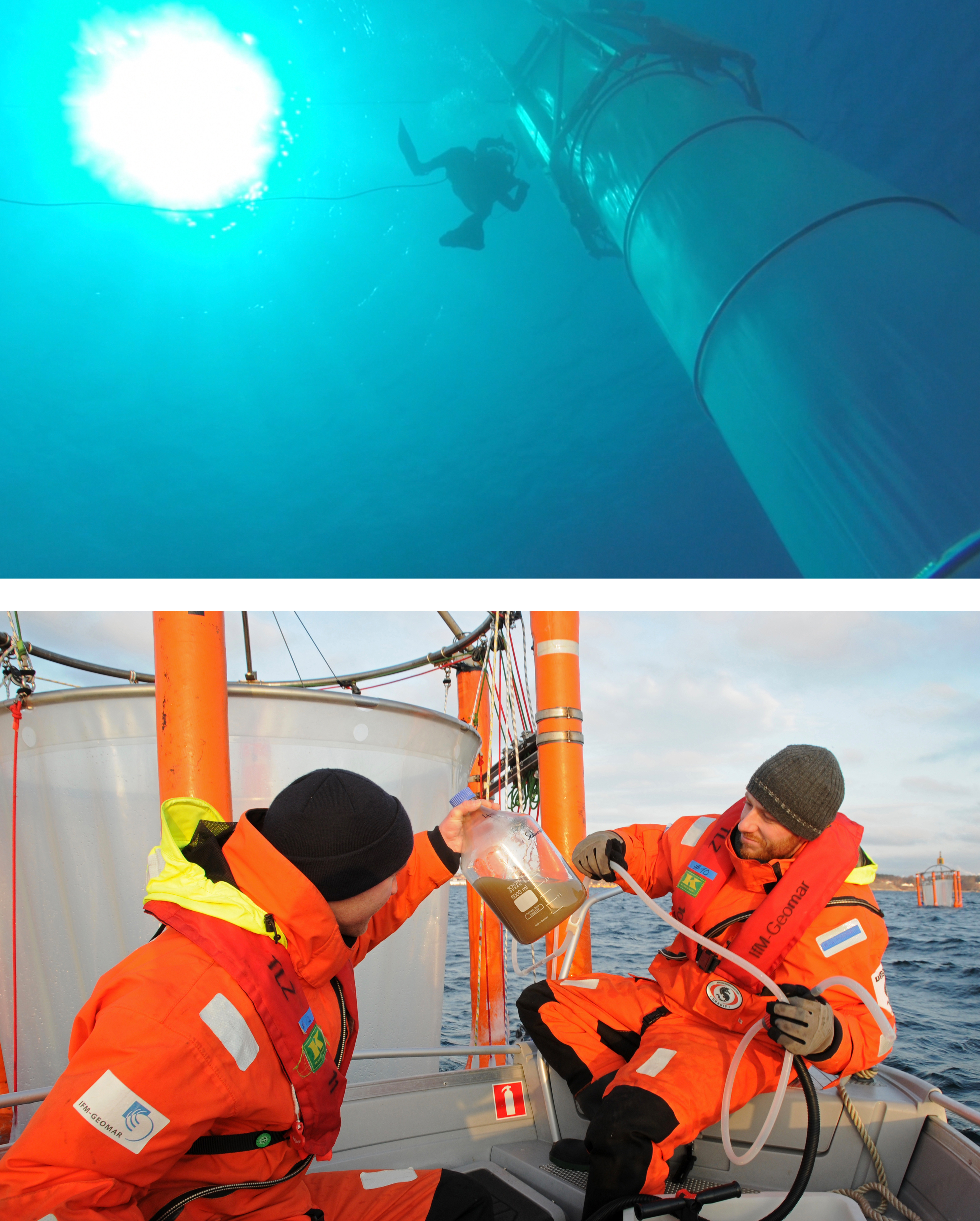 The analysis of organic material sinking out of the ocean’s surface layer is at the core of our research. This downward flux of biogenic particles, commonly referred to as the "biological pump", plays a key role in driving marine carbon and nutrient cycles, e.g. by transferring 5-12 Gt of carbon to the deep ocean, and thereby controlling the long-term storage of atmospheric CO2. Sinking particles are mainly comprised of "left-overs" of the marine food web, e.g. phytoplankton aggregates ("marine snow") or fecal pellets released by zooplankton grazers. To assess how this carbon flux to the deep ocean could be altered in the future, we conducted a series of field experiments with pelagic "mesocosms". These are basically giant test tubes floating in the ocean, in which we can examine marine plankton communities and biogeochemistry under close-to-natural conditions. At the same time they allow us to manipulate CO2 concentrations as expected for the coming decades.